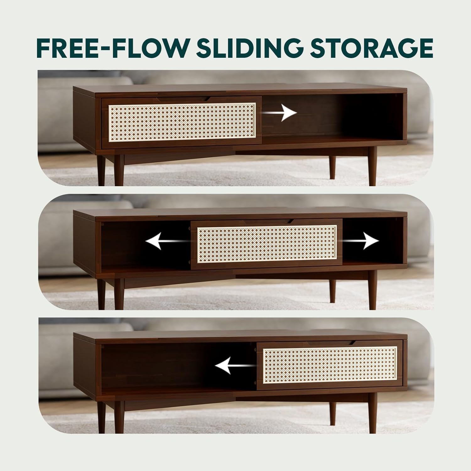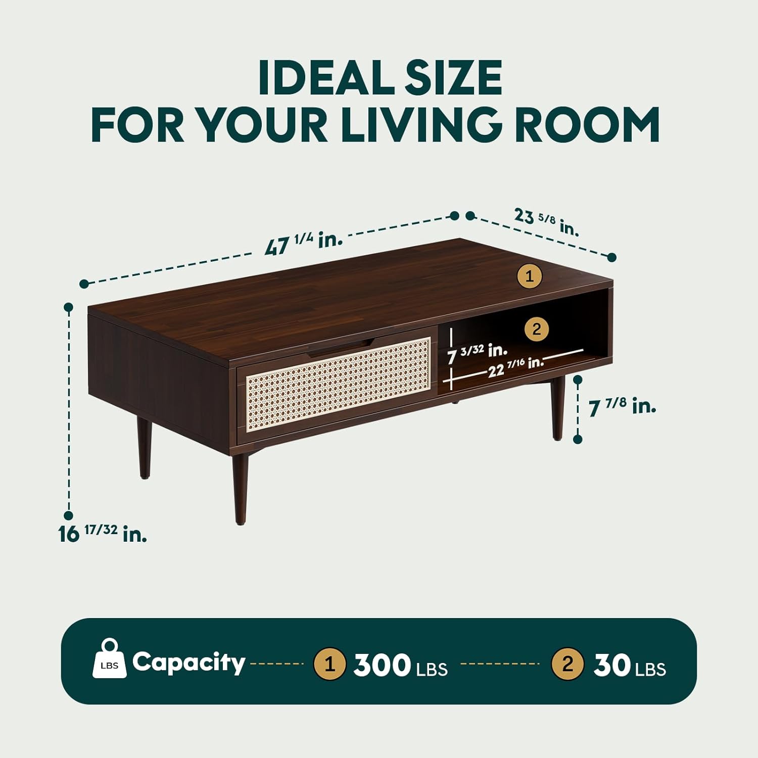 Bme Oliver Coffee Table, Mid Century Modern Coffee Table, Side Table with Storage, 2 Drawers & Open Compartments, Solid Wood Legs with Adjustable Levelers, Rattan Accent for Living Room, Walnut