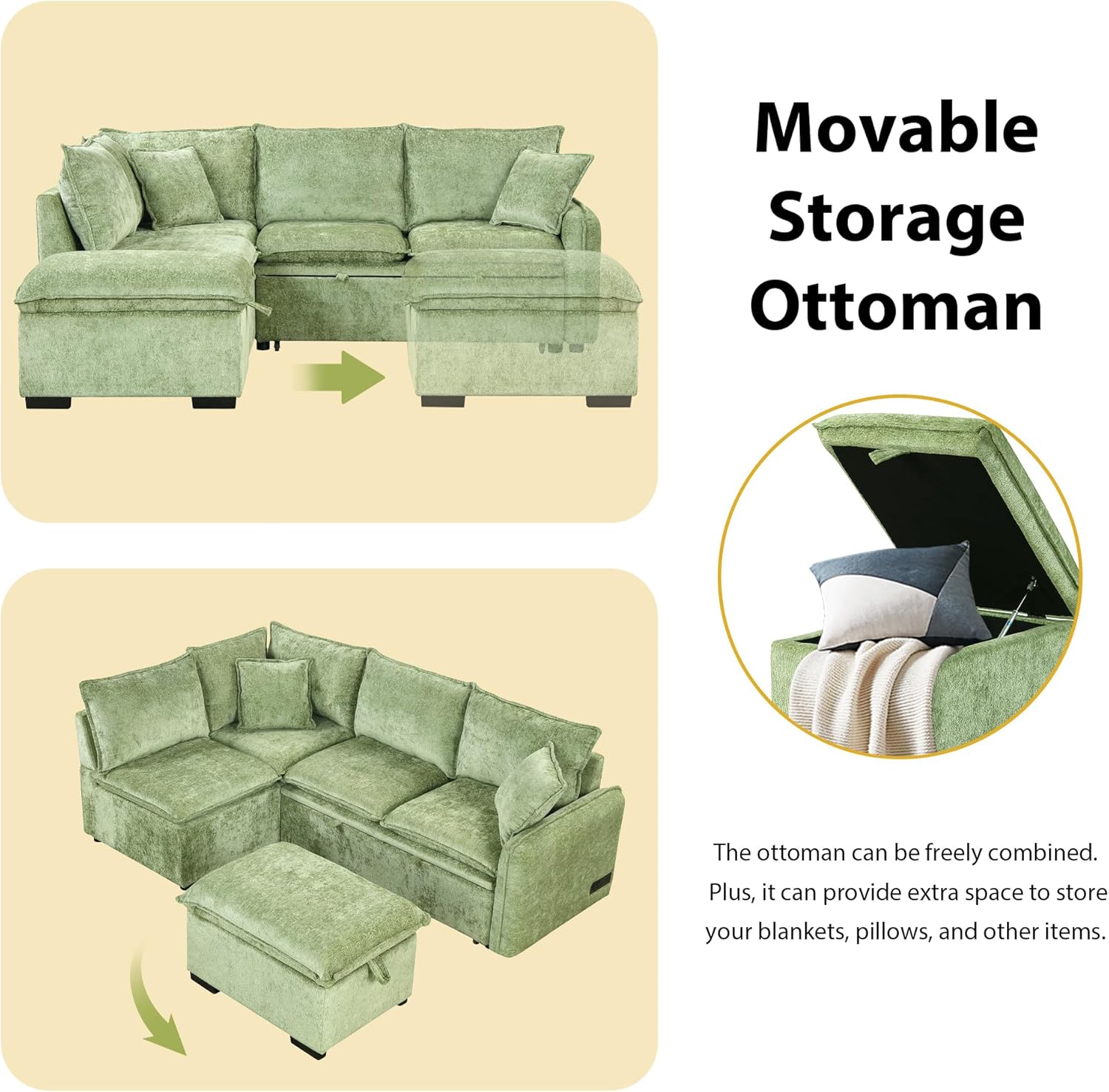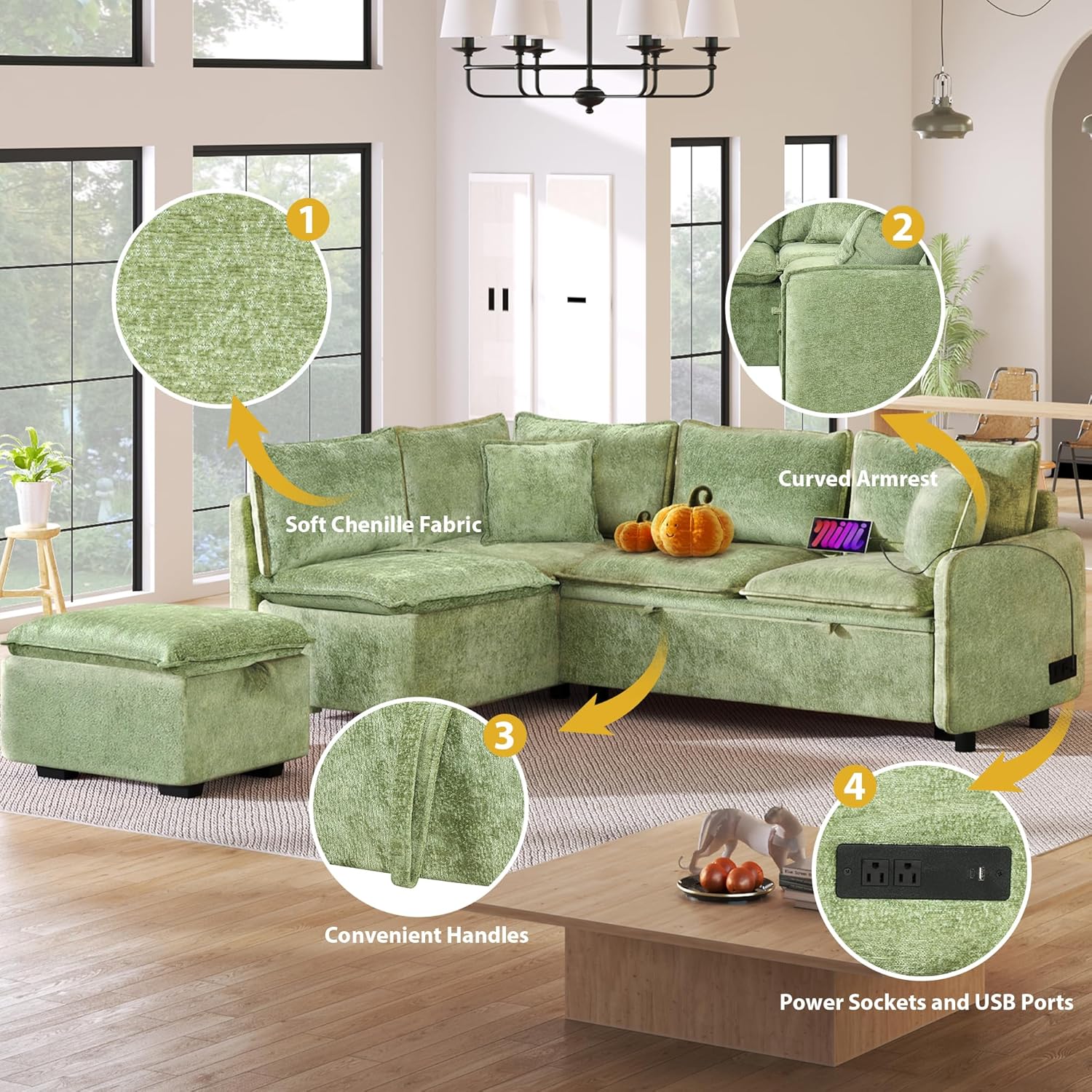 Ball & Cast 82.67" L-Shaped Sectional Pull Out Sofa with Two USB Ports,4-Seater Convertible Couch w/Power Sockets and Movable Storage Ottoman,for Living Room,Apartment,Green