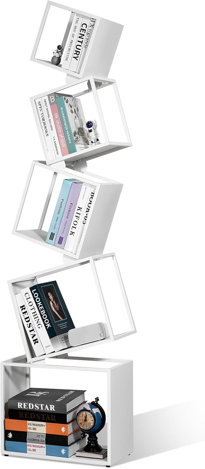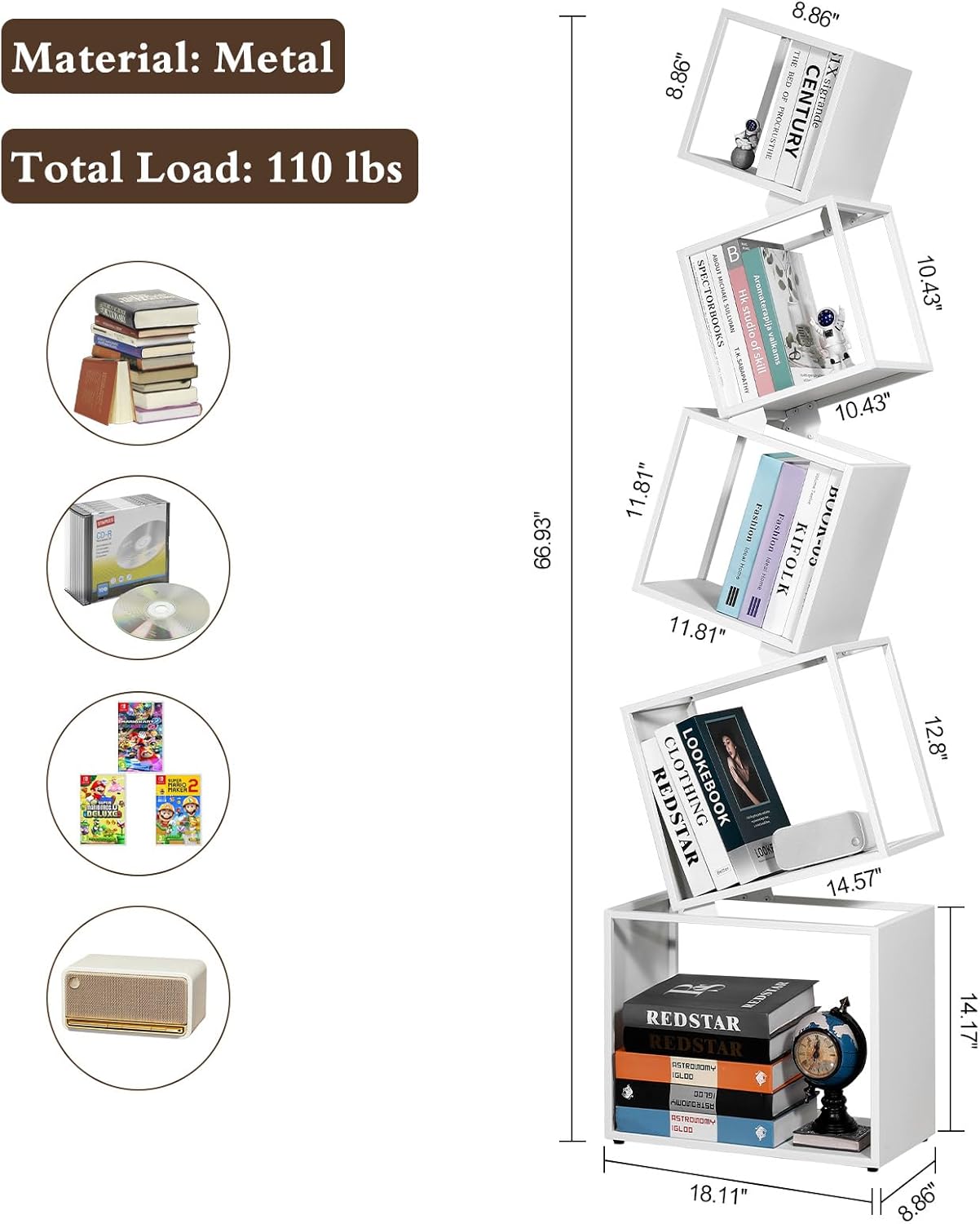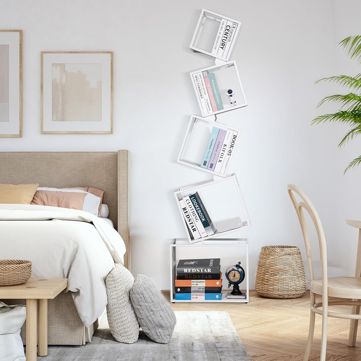 67-Inch 5-Tier Floating Bookshelf – Staggered Geometric Design, Freestanding Metal Storage & Display Rack for Home & Office (White)