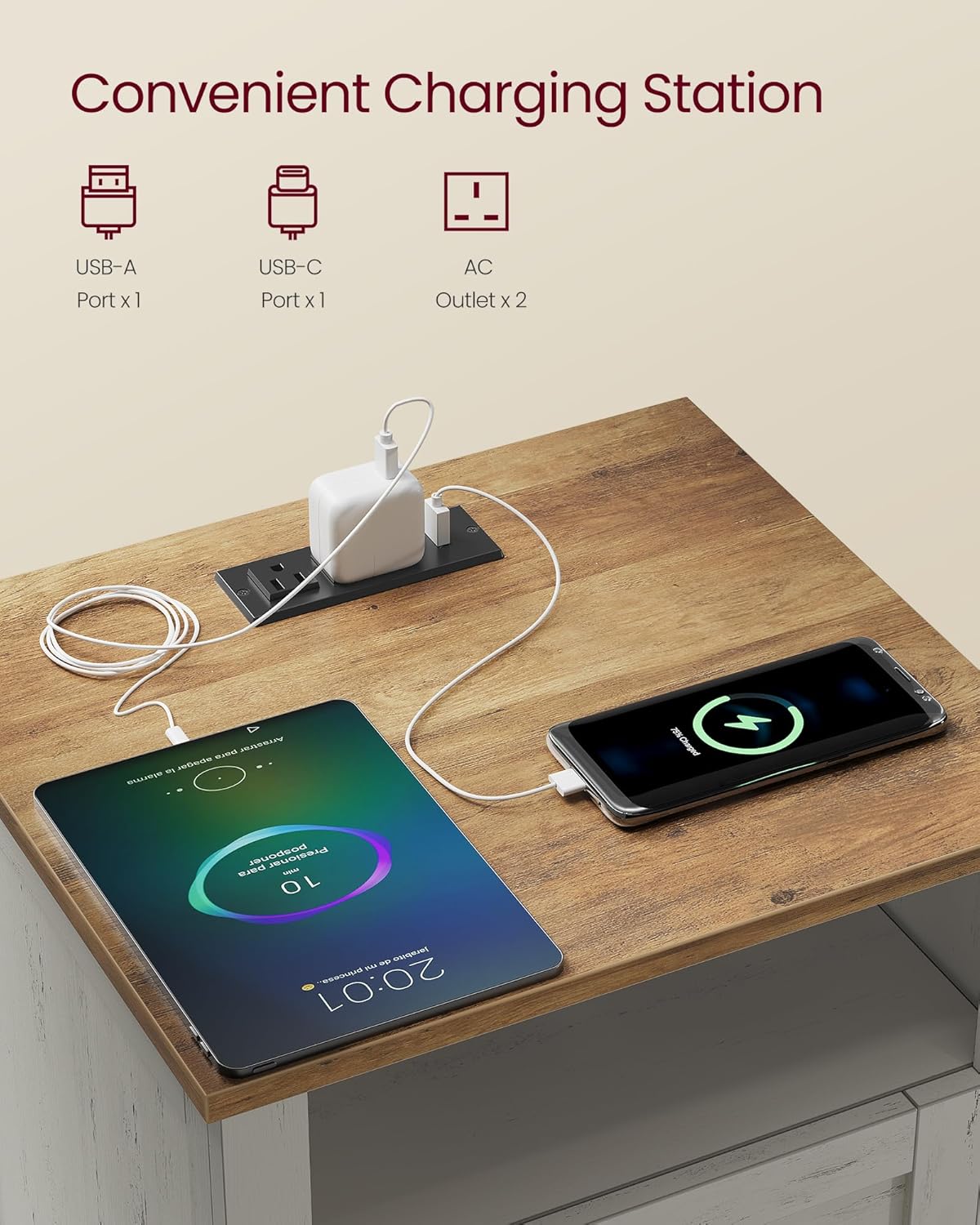 - [Convenient Charging Station] Stay away from low battery alerts with our nightstand's built-in charging station. It includes 1 USB-A port, 1 USB-C port, and 2 AC outlets, providing a handy power source for your devices