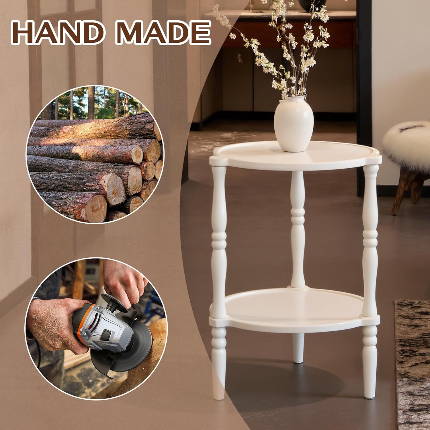Accent Wood End Table, 2-Tier Round Bedside Table, Natural Side Table Nightstand for Family, Bedroom, Living Room, Handcrafted Finish, White