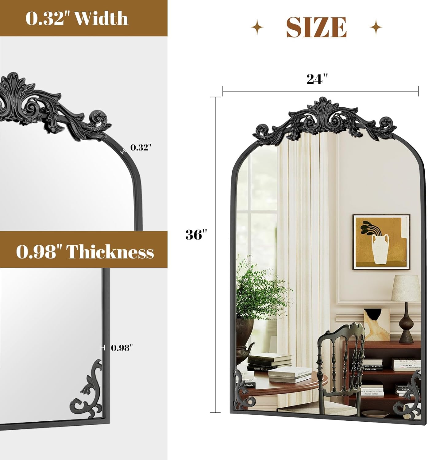 - Pretty Decorative Mirror: The engraving on this wall mirror will add design and vintage flair to your room. The classic black mirror can bring upscale decor to a minimalist room, and gold mirror bring a chic look to a traditional room