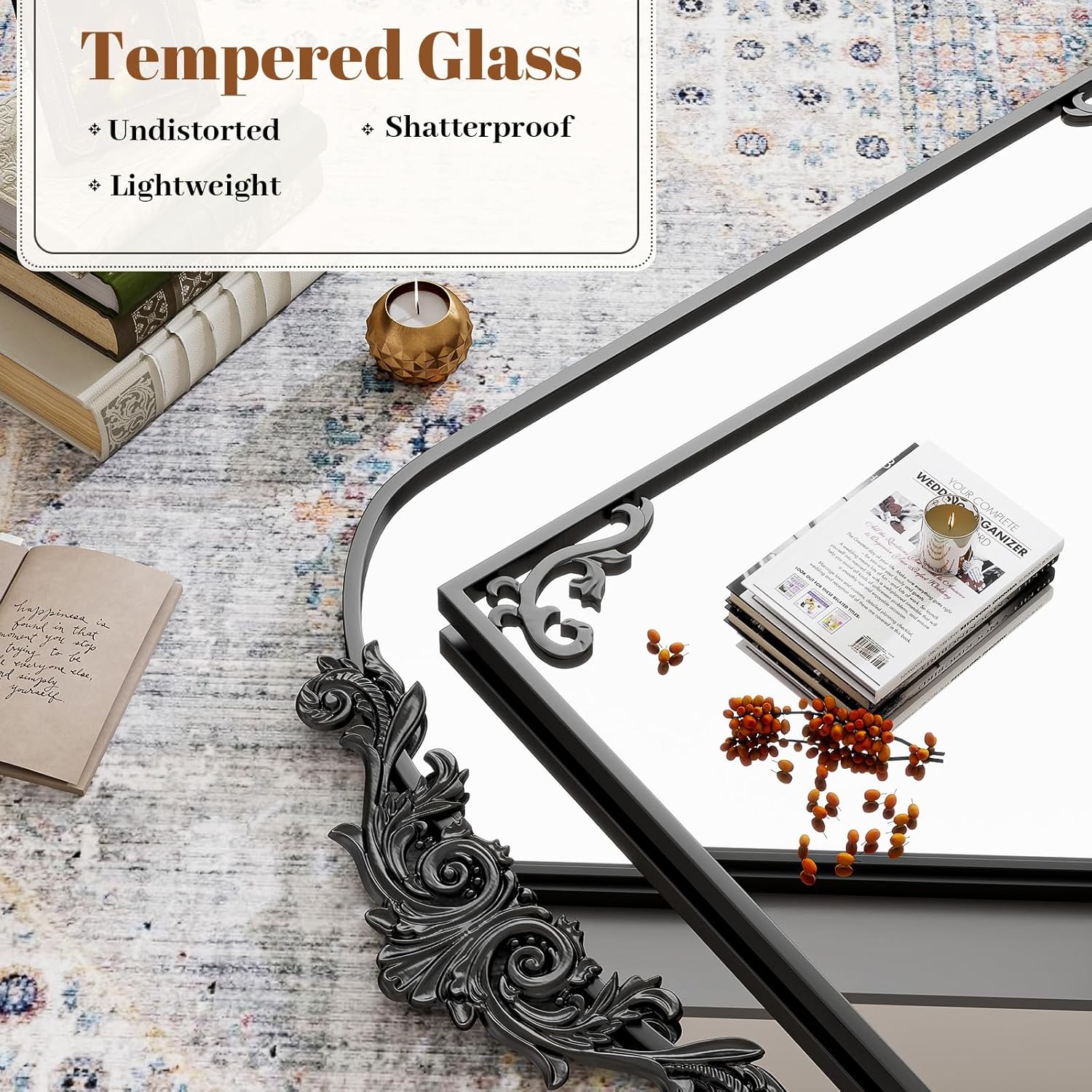 - Tempered Glass: The beautiful wall mirror made of tempered glass that does not distort. The technologically improved glass is sturdy and not fragile, accidental breakage will become granular glass shards that won't scratch you