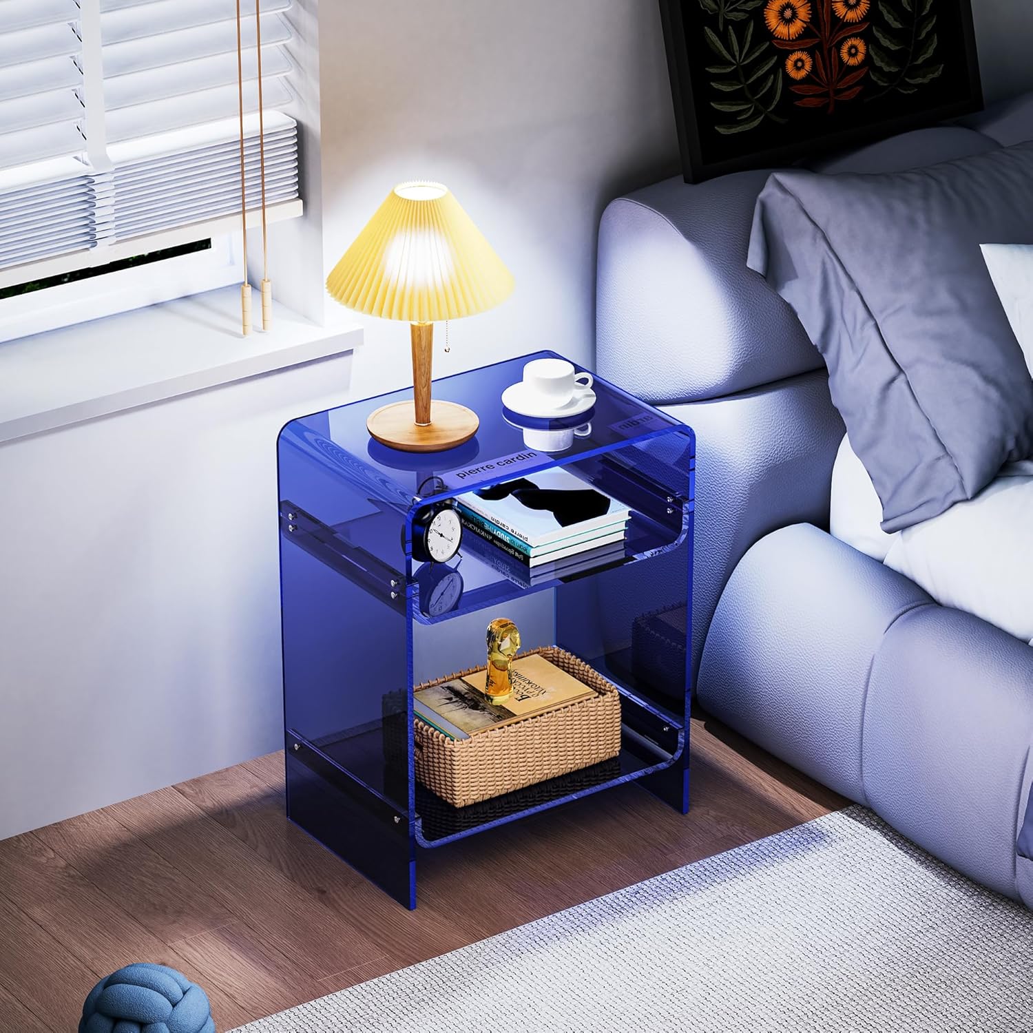 Acrylic Record Player Table with Storage Shelf, Clear Side Table Nightstand (Dark Blue)