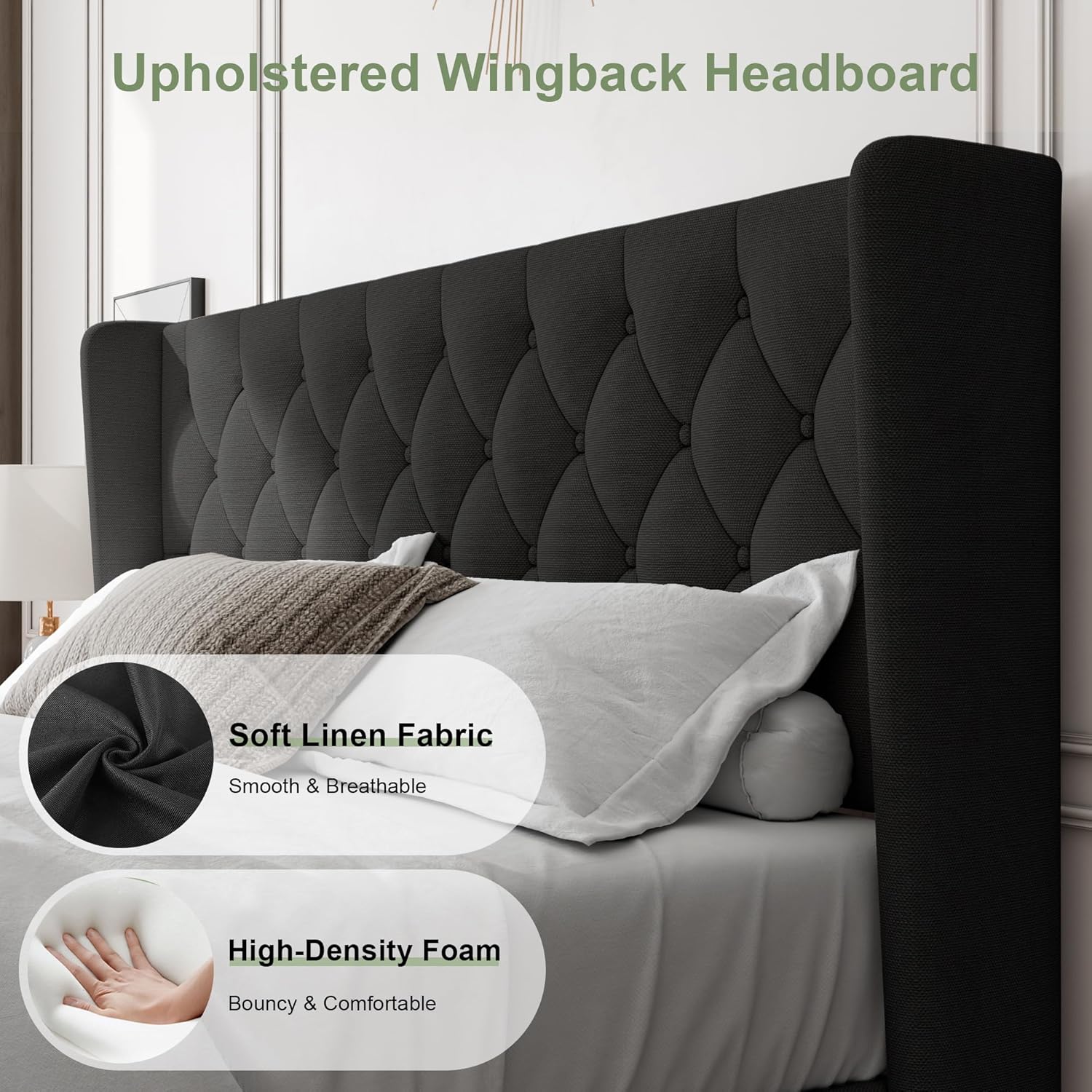 - Special Feature : 8" Under-Bed Storage, Modern & Classic Style, Noise-Free, Upgraded Heavy-Duty Structure, Upholstered Wingback Headboard 8" Under-Bed Storage, Modern & Classic Style, Noise-Free, Upgraded Heavy-Duty Structure, Upholstered Wingback Headboard