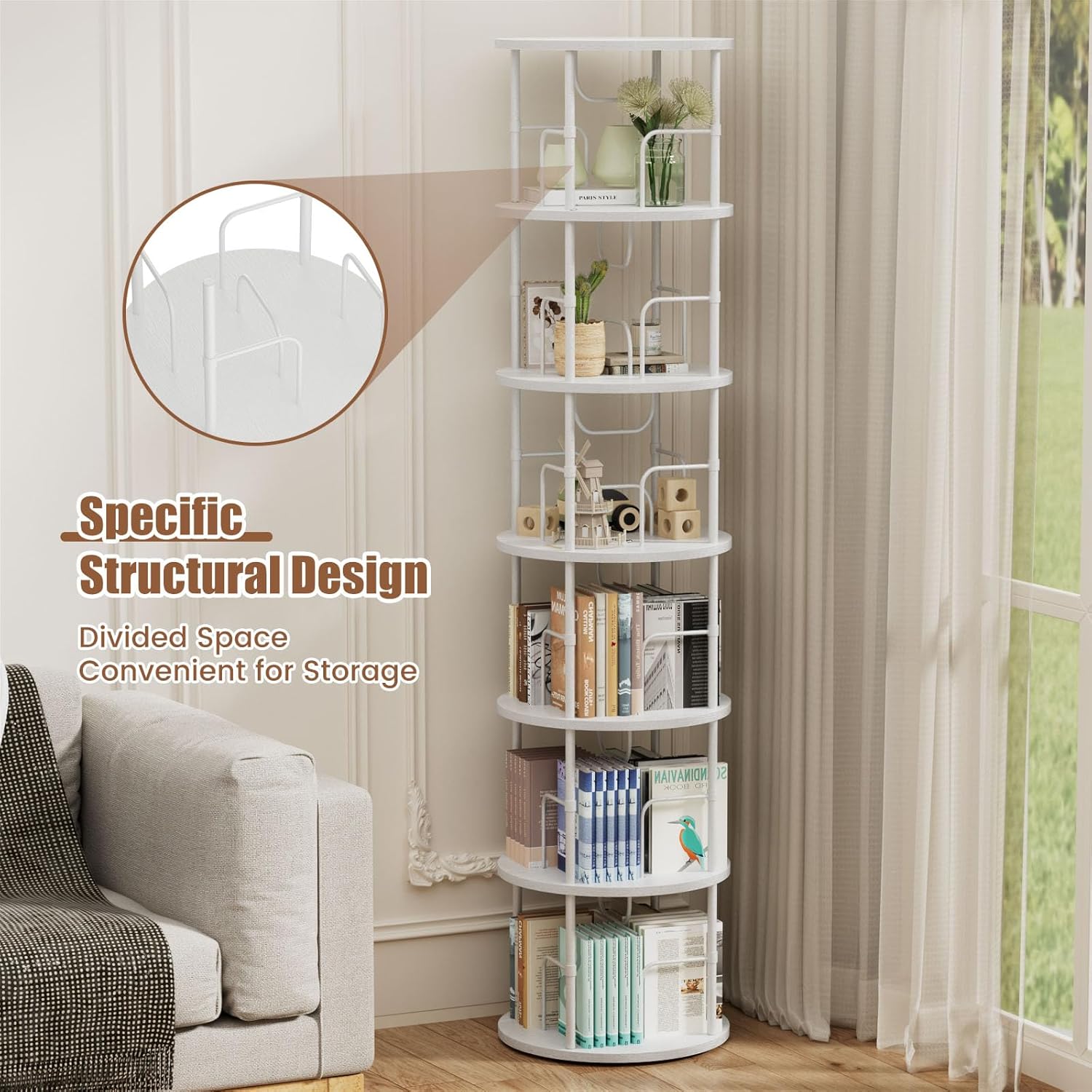 - 【Smooth 360° Rotating Bookshelf】:Allstand tall spinning bookshelf is equipped with a turnplate on the bottom,can rotate 360 degrees freely. With a gentle spin, easily get the items you need. Besides, the open book shelf are perfect for all your books and displays, adding a lot of artistry and flexibility. Unique round bookshelf design can be avoided bumped on the edges, more thoughtful!