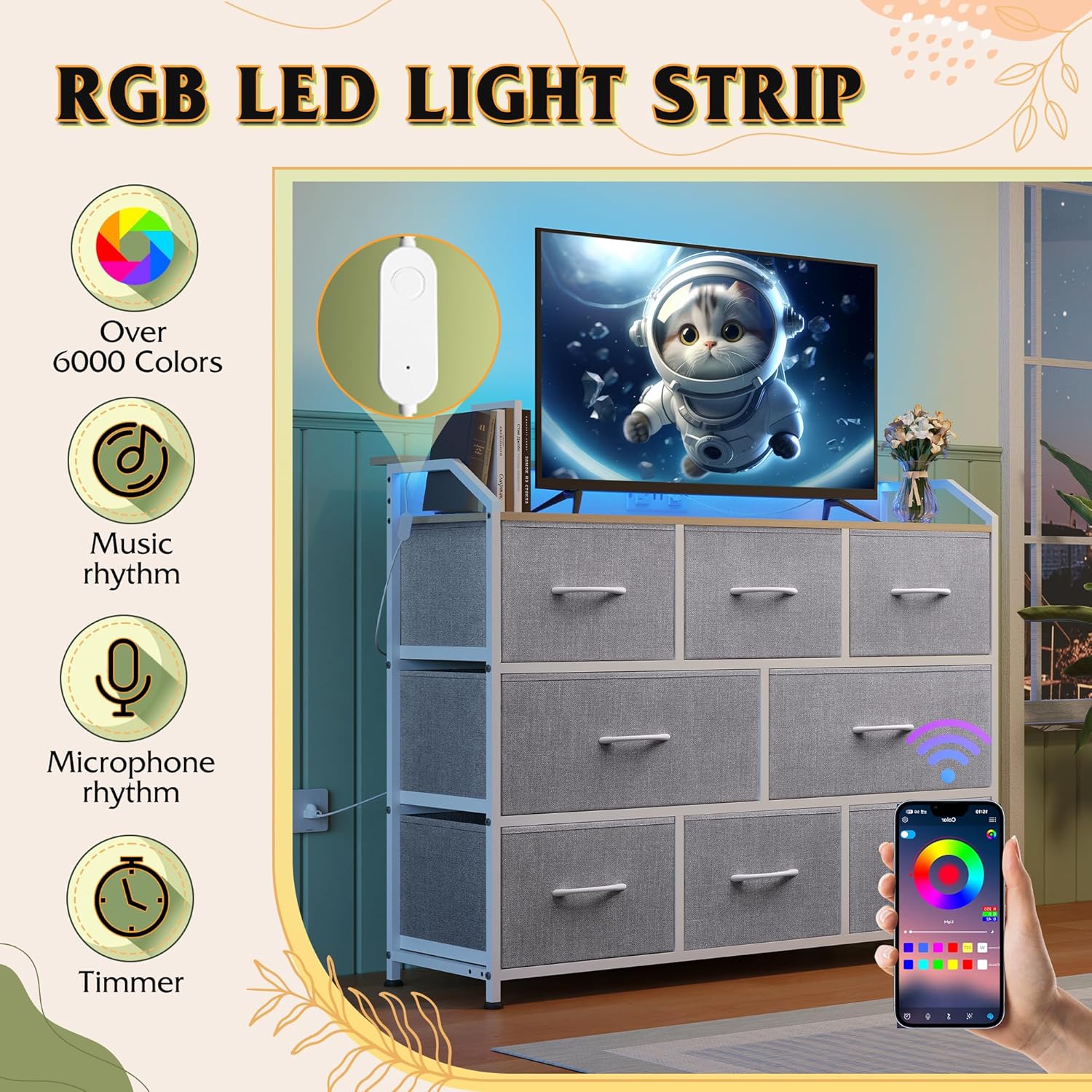 - 【✨Modern Customizable LED Light】This wide fabric dresser is equipped with countless (at least 31) light modes and colors, you can freely adjust the brightness and colors for any scene. The dresser with charging station has 2 USB ports, so you can easily charge your media devices without the need for extra extension cords
