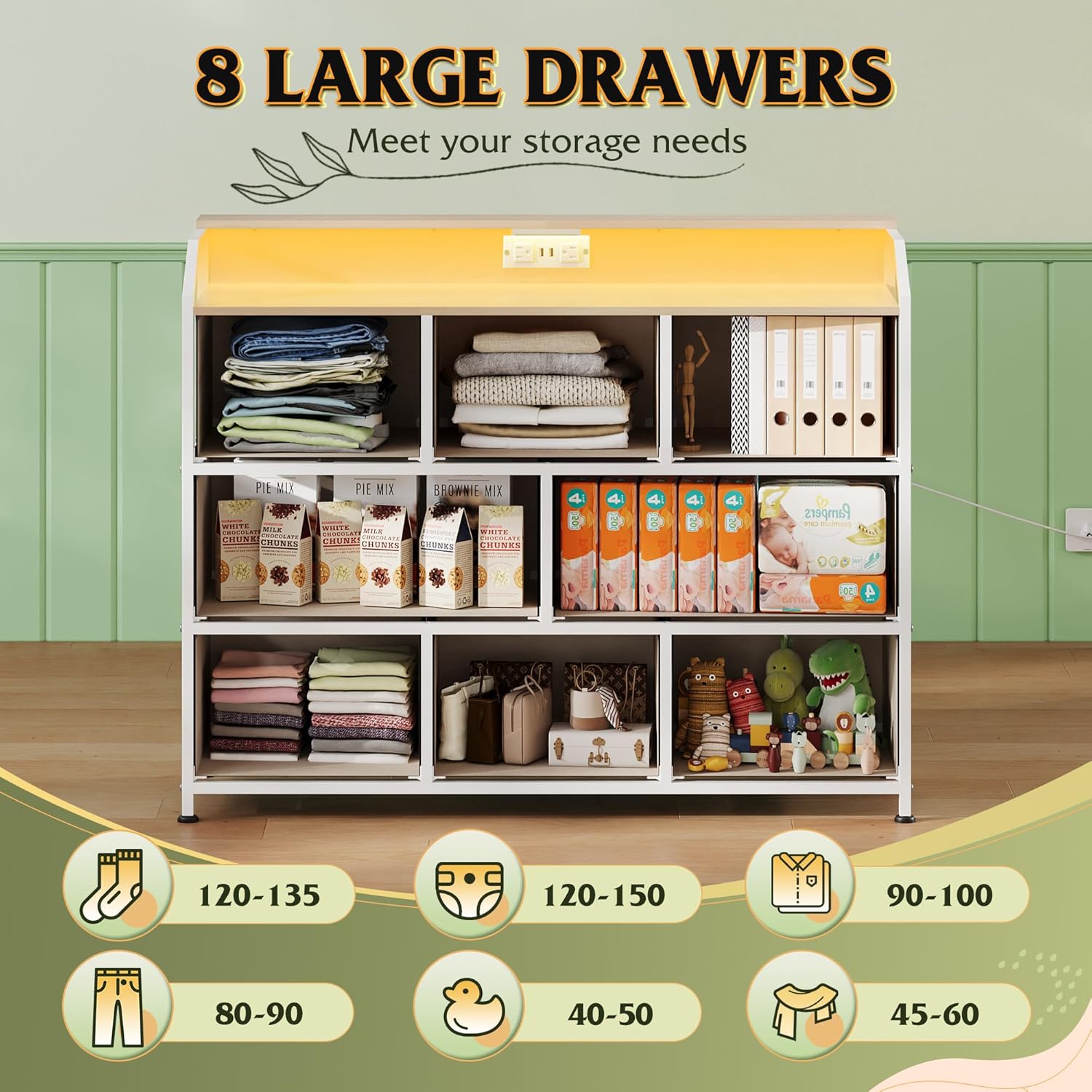 - 【🌙Versatile Storage】The TV stand for bedroom features 8 drawers can be used as a media console table behind the entertainment center, entryway table in the living room, bedroom, and the light can also serve as a night light to illuminate for you when you wake up at night and help you overcome your fear of the dark