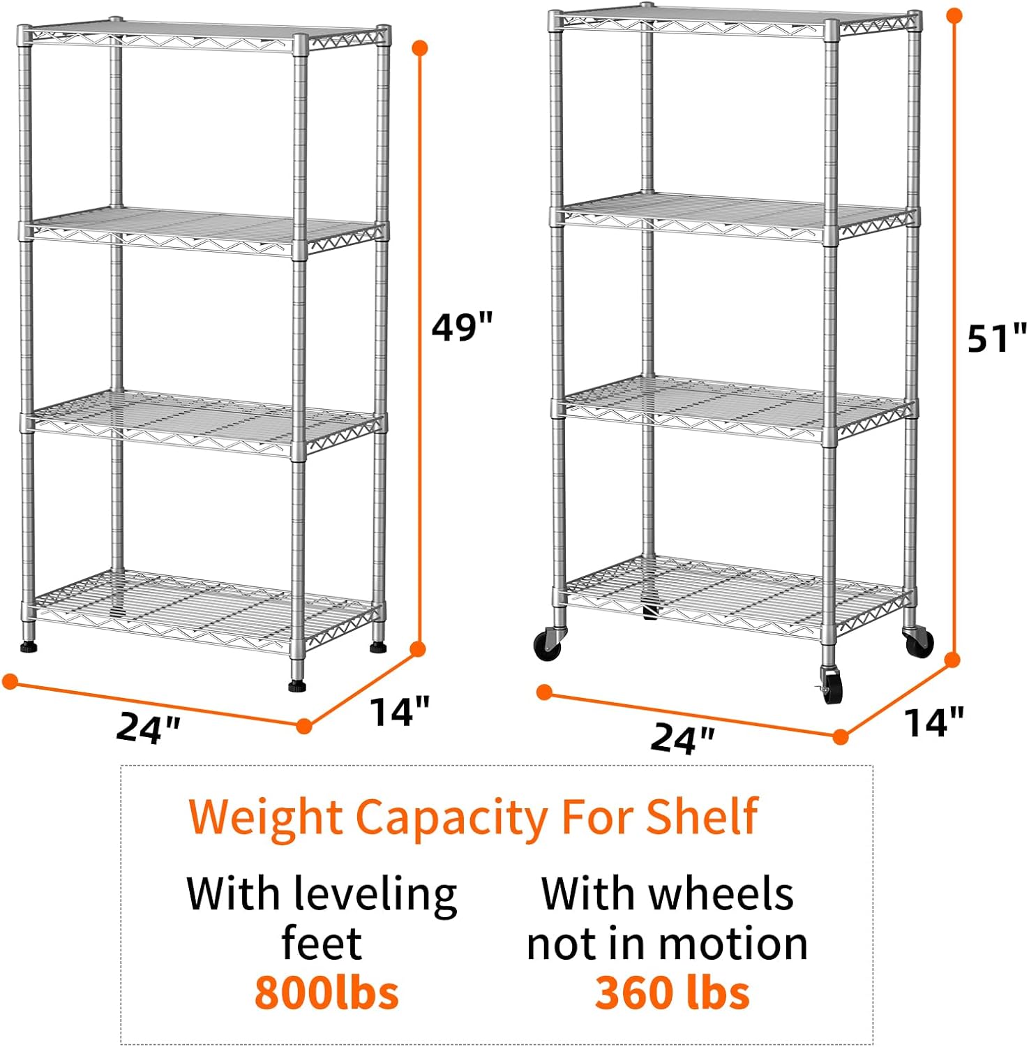 - Convenient Home Storage: Metal wire shelves with adjustable spacing (14”D X 24”W X 49”H) make perfect for narrow spaces or room corners such as kitchens, bathrooms, laundry rooms, balconies, garages, entries, or offices.