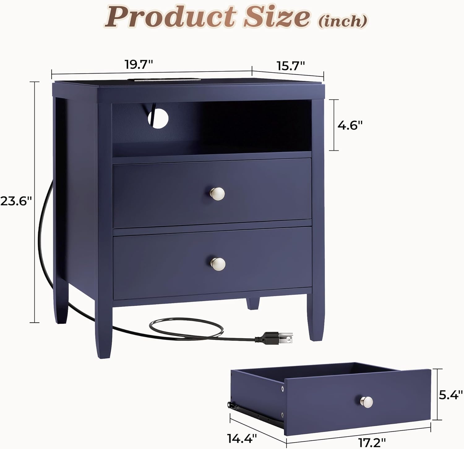 Huuger Blue Nightstand Set of 2, Night Stand with Charger Station, Bedside Table with 2 Drawers, Bed Side Tables for Bedroom, Modern Nightstands, Metal Knobs, Painted Surface