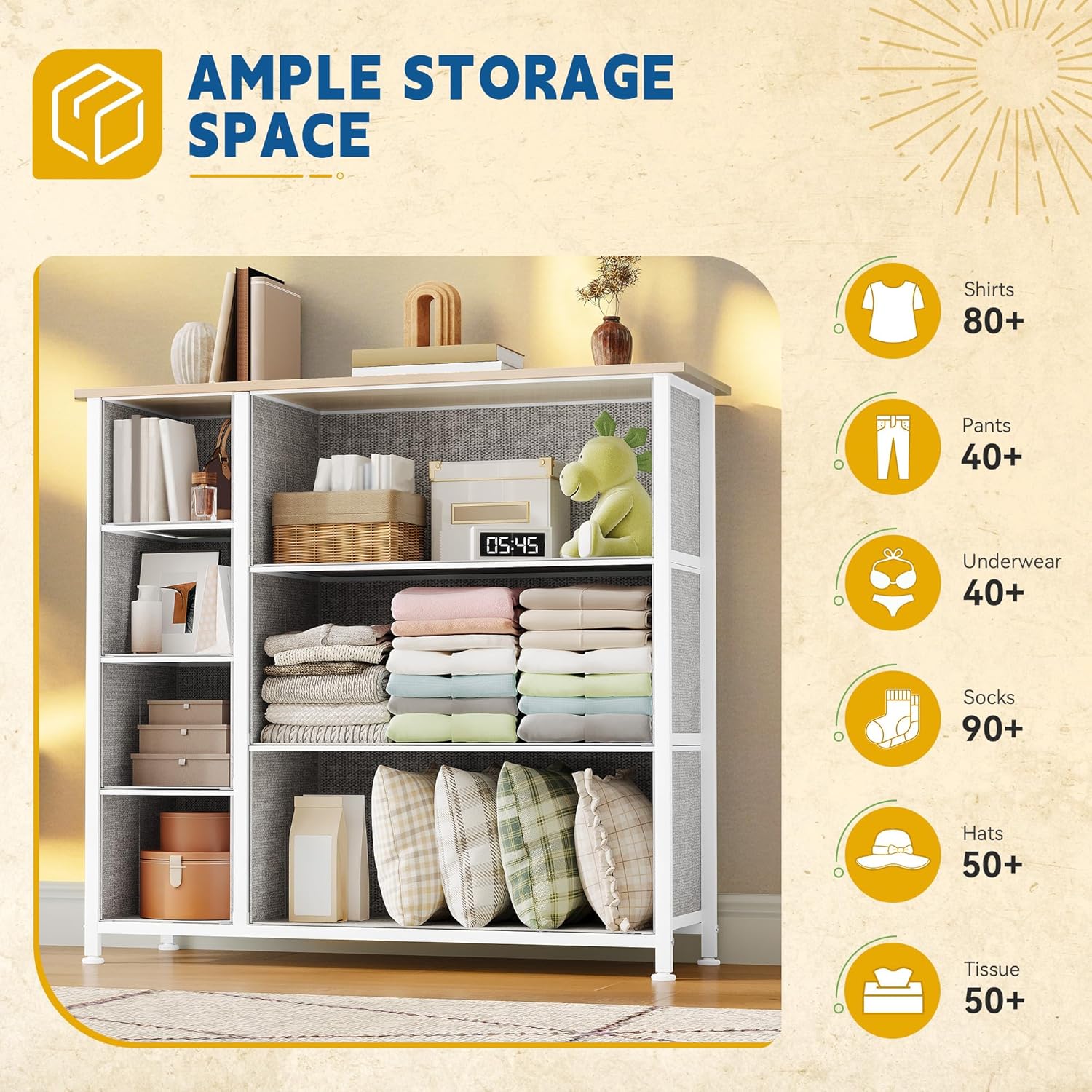 - VERSATILE DRESSER FOR BEDROOM- DWVO fabric dresser is a clean expression that fits right into your bedroom, living room, hallway, entryway, closet