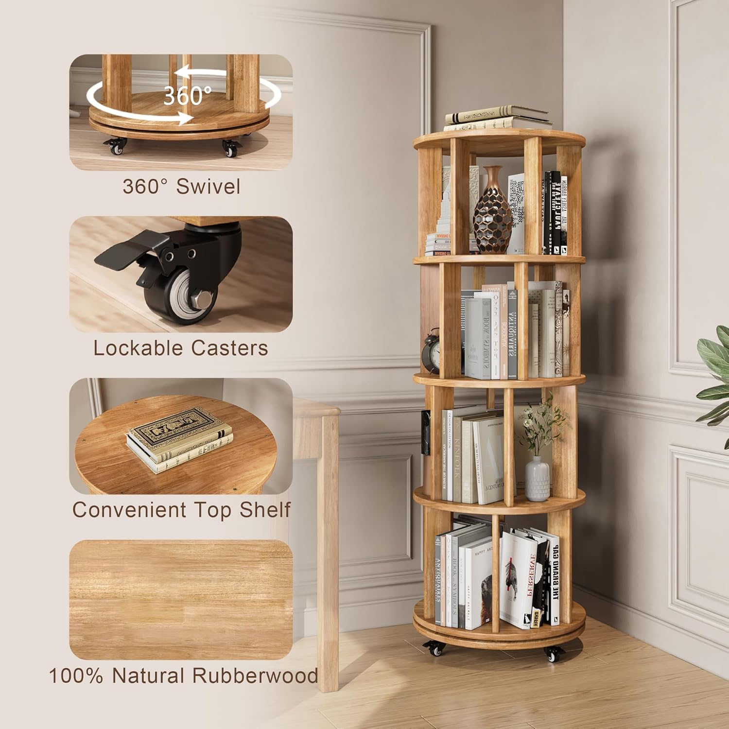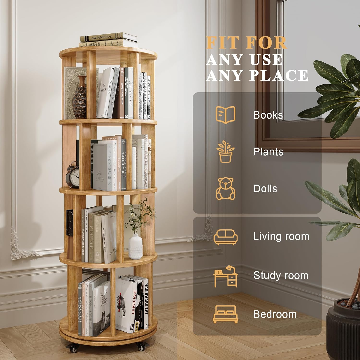 - 【Sturdy 360° Rotating Bookshelf】 - The spinning bookshelf tower is made of eco-friendly and sturdy natural rubber wood, steel screws fixing provides great stability, won't tilt or swing. This spinning bookshelf is equipped with a turnplate on the bottom, allows smooth 360° rotation freely, easy for you to find and access all your books.