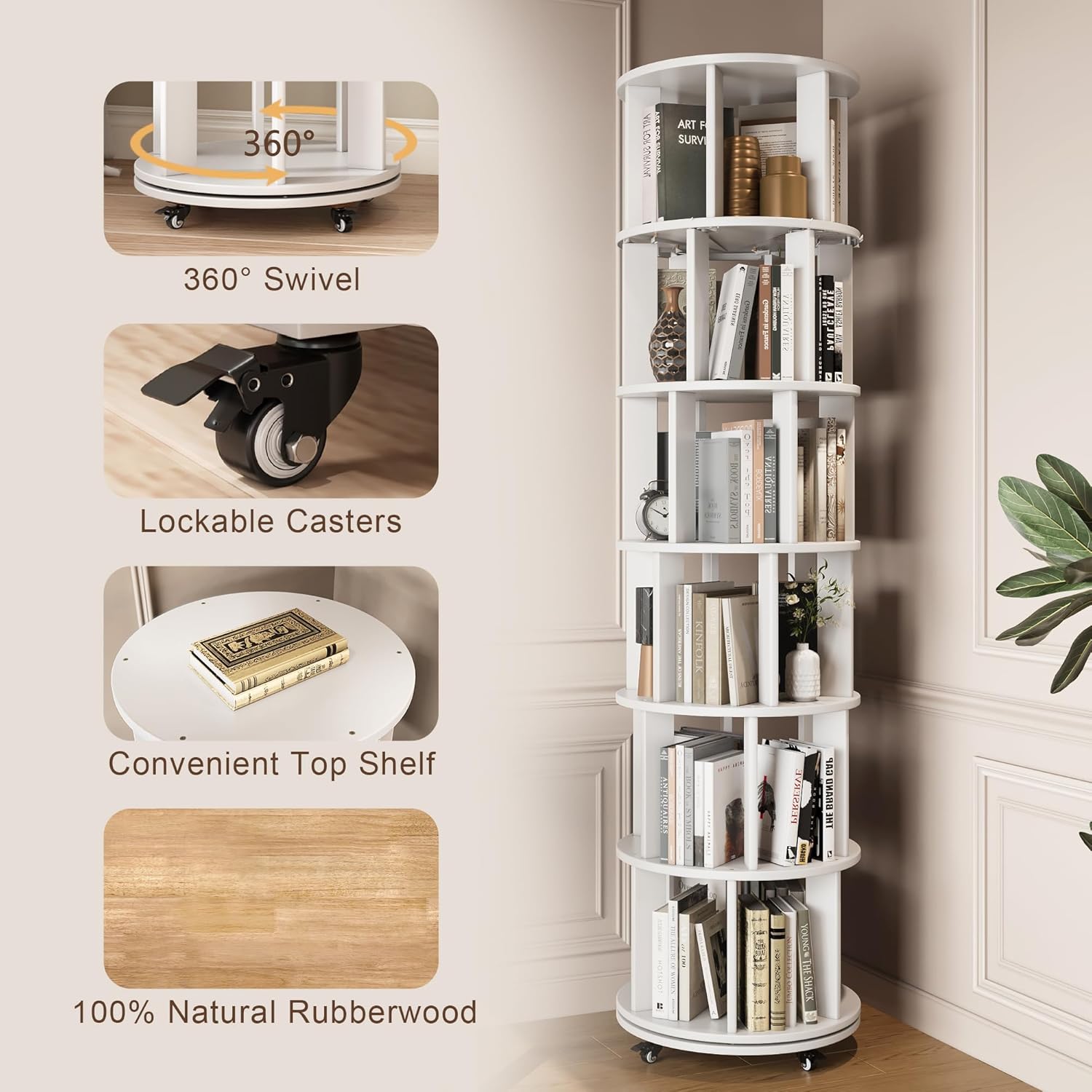 - Sturdy 360° Rotating Bookshelf - The spinning bookshelf tower is made of eco-friendly and sturdy natural rubber wood, steel screws fixing provides great stability, won't tilt or swing. This spinning bookshelf is equipped with a turnplate on the bottom, allows smooth 360° rotation freely, easy for you to find and access all your books.