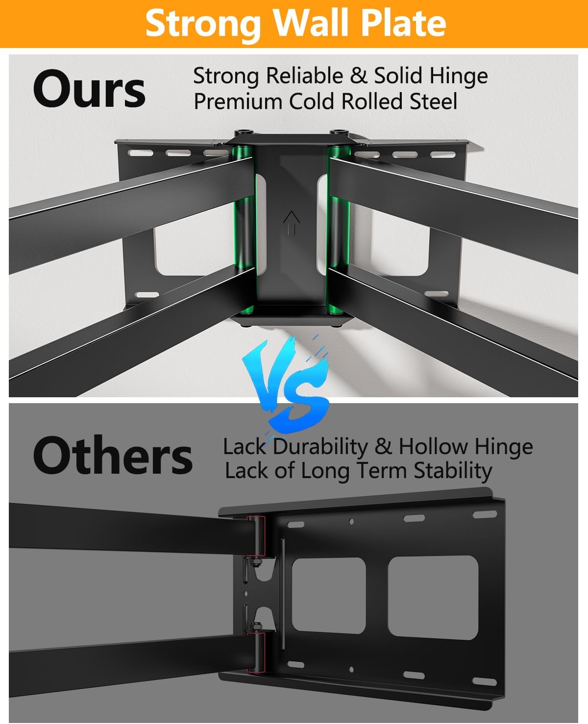 - Proven Durability: Crafted from high-strength steel with 35% thicker dual articulating arms, this heavy-duty TV mount 85 inch is engineered for unmatched strength and stability that ensure support and reliability for ultra-large TVs up to 198 lbs..This full swivel tv wall mount was quality tested(3 times loading testing) to hold 660lbs at once no break. DON'T RISK IT! You already spent Thousands on a Crisp Flat Screen, don't jeopardize that investment by hanging it on a flimsy extendable tv wall mount . Secure your investment with the Strongest extending tv mount on the market. Choose Forging Mount XXL tv wall mount 75 inch !
