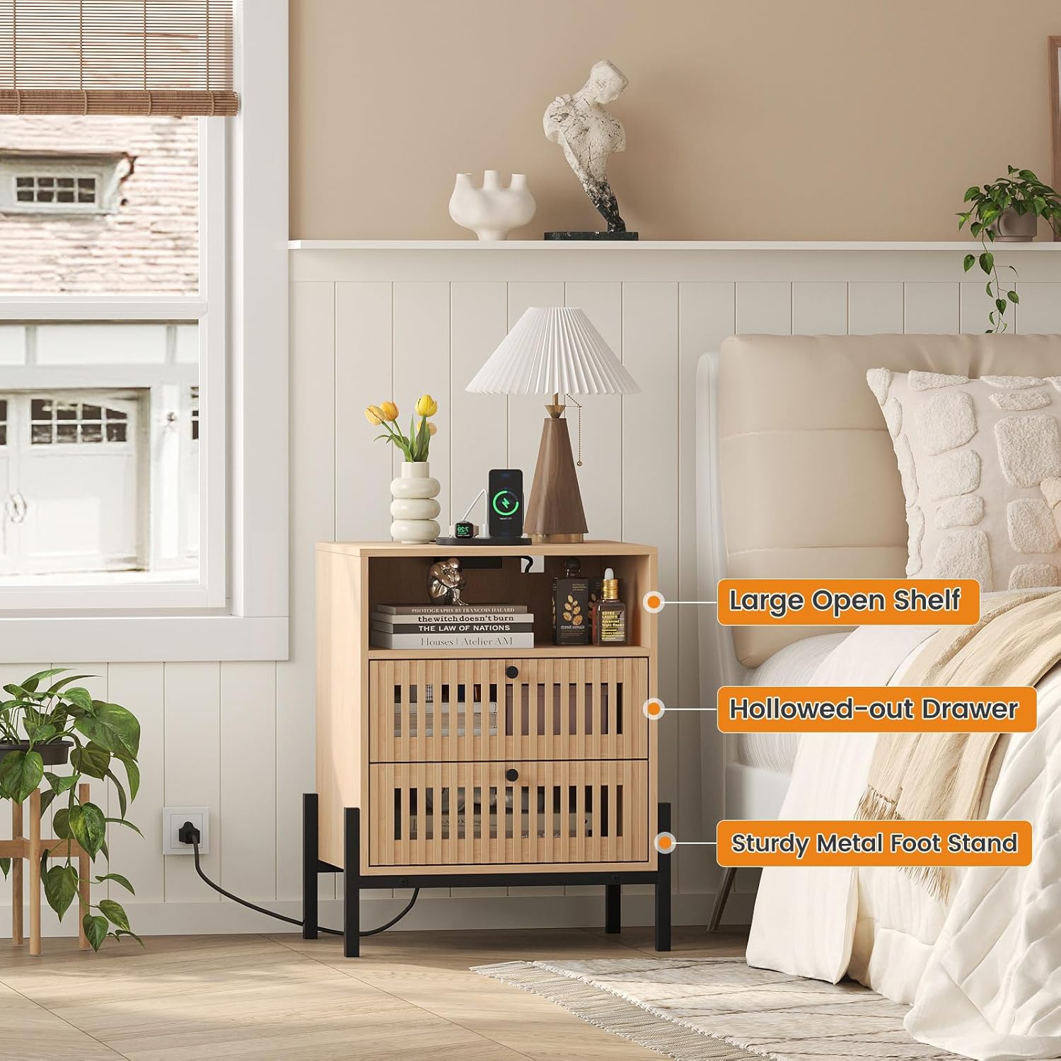 - Ample Storage : The two inside visible drawers provide ample storage space for your essentials, keeping your room tidy and organized, while the open shelf is perfect for displaying decor or holding bedtime reading materials.