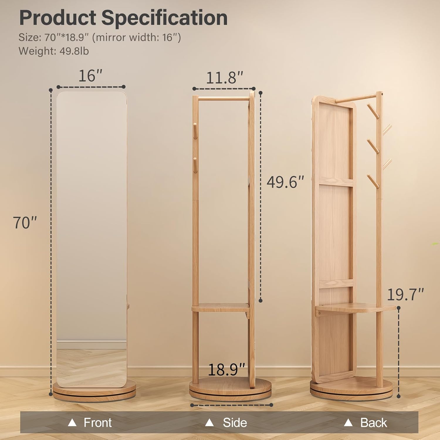 70"x16"Full Length Mirror with Stand,Coat Rack with Mirror,Solid Wood Floor Mirror,Swivel Mirrorfor Bedroom, Living Room, Cloakroom
