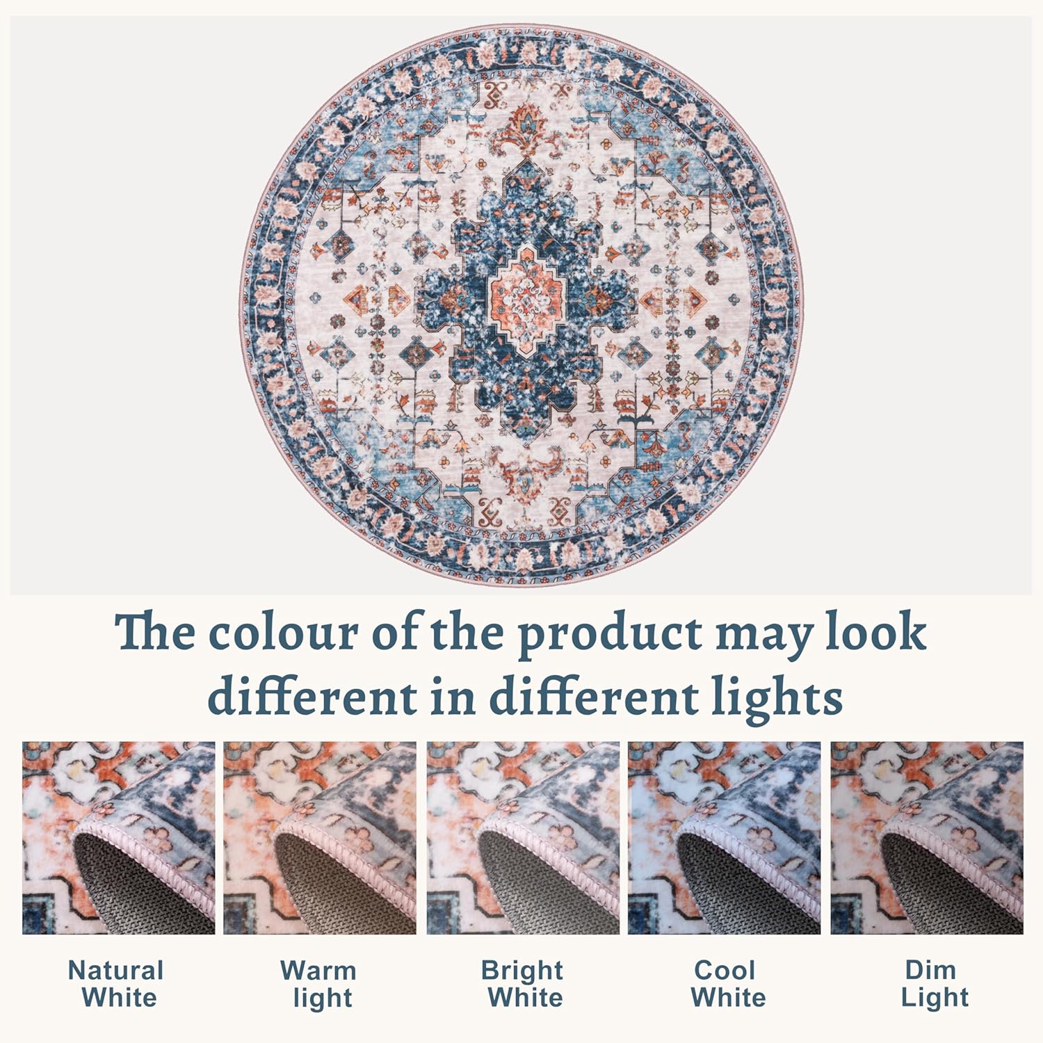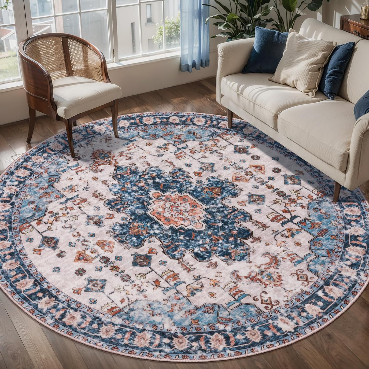 Tangsoo Vintage Round Rug 6ft, Washable Circle Rug, Non Slip Boho Round Area Rug,Low Pile Circular Rugs,Large Round Rugs Carpet for Livingroom,Bedroom,Nursery,Dorm,Office,Blue/Orange