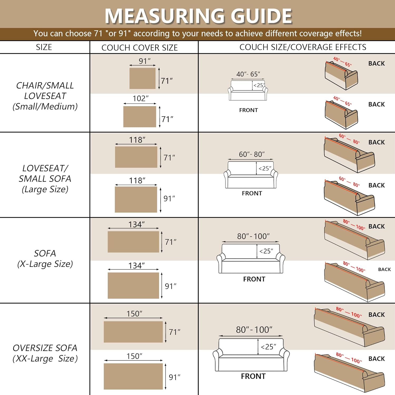 - Product Size: We offer a variety of sizes for you to choose from,Medium Size (71"x91",71"x102") for loveseat sofa futon chair,Large Size (71"x118", 91"x118") for 2-3 seats,X-Large Size (71"x134", 91"x134") for 3 seats, XX-Large Size (71"x150", 91"x150") for 4 seats, choose the right size according to the actual sofa size. You can choose 71" or 91" according to your needs to achieve different coverage effects!