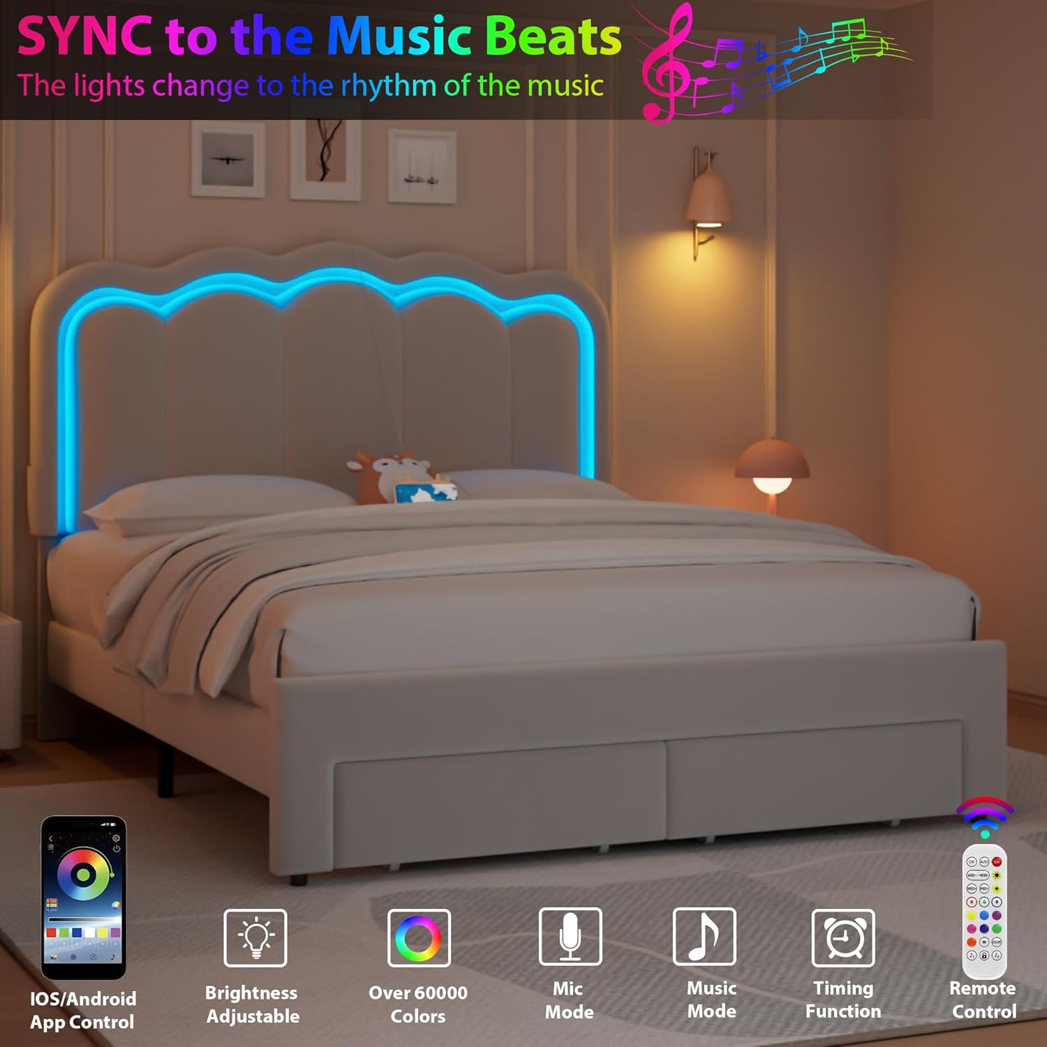 - SMART RGB LIGHTS WITH MUSIC SYNC: This full bed frame for kids with built-in RGB LED headboard transforms your bedroom with over 16 million colors, 20+ light effects, and dynamic modes controlled by app or remote. Bold lights sync with music, setting the ideal vibe for relaxing, reading, or entertaining. From gentle nightlight for kids to vivid party colors, this velvet bed frame makes every moment magical with immersive ambiance