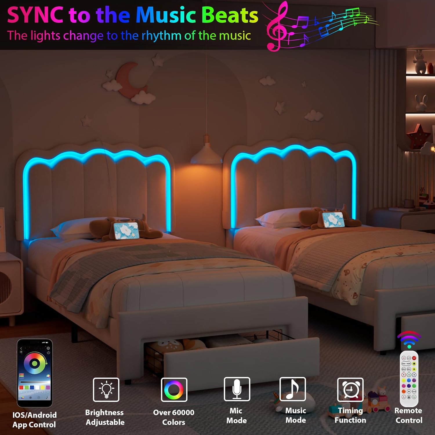 - SMART RGB LIGHTS WITH MUSIC SYNC: This twin bed frame for kids with built-in RGB LED headboard transforms your bedroom with over 16 million colors, 20+ light effects, and dynamic modes controlled by app or remote. Bold lights sync with music, setting the ideal vibe for relaxing, reading, or entertaining. From gentle nightlight for kids to vivid party colors, this velvet bed frame makes every moment magical with immersive ambiance