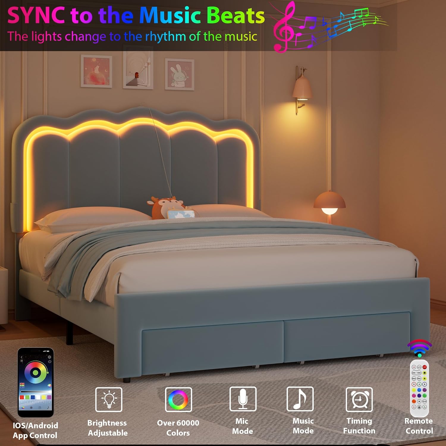 - SMART RGB LIGHTS WITH MUSIC SYNC: This full bed frame for kids with built-in RGB LED headboard transforms your bedroom with over 16 million colors, 20+ light effects, and dynamic modes controlled by app or remote. Bold lights sync with music, setting the ideal vibe for relaxing, reading, or entertaining. From gentle nightlight for kids to vivid party colors, this velvet bed frame makes every moment magical with immersive ambiance