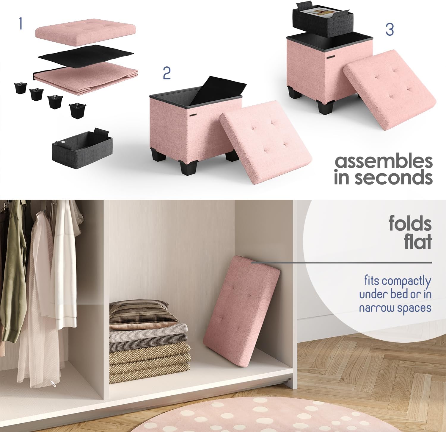 STORAGEBUD Storage Ottoman Cube with Small Bin, 16-in Square Ottoman with Storage for Living Room and Bedroom, Small Ottomans Foot Rest, Fabric Foot Stools Ottomans Max 330lbs, Pink