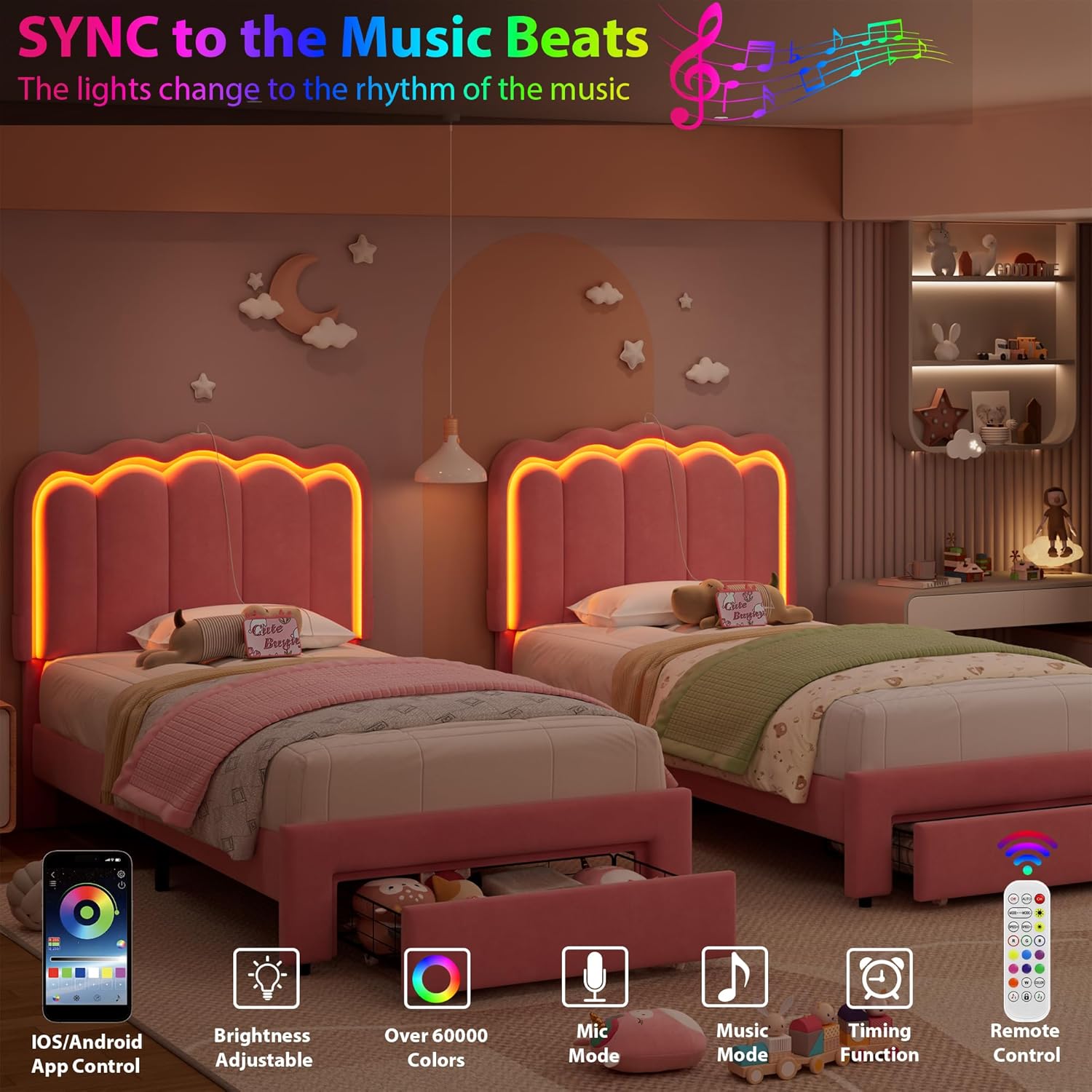 - SMART RGB LIGHTS WITH MUSIC SYNC: This twin bed frame for kids with built-in RGB LED headboard transforms your bedroom with over 16 million colors, 20+ light effects, and dynamic modes controlled by app or remote. Bold lights sync with music, setting the ideal vibe for relaxing, reading, or entertaining. From gentle nightlight for kids to vivid party colors, this velvet bed frame makes every moment magical with immersive ambiance