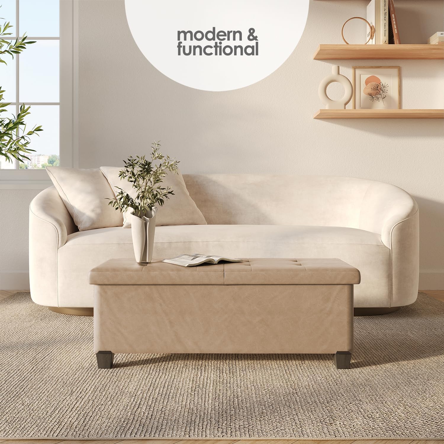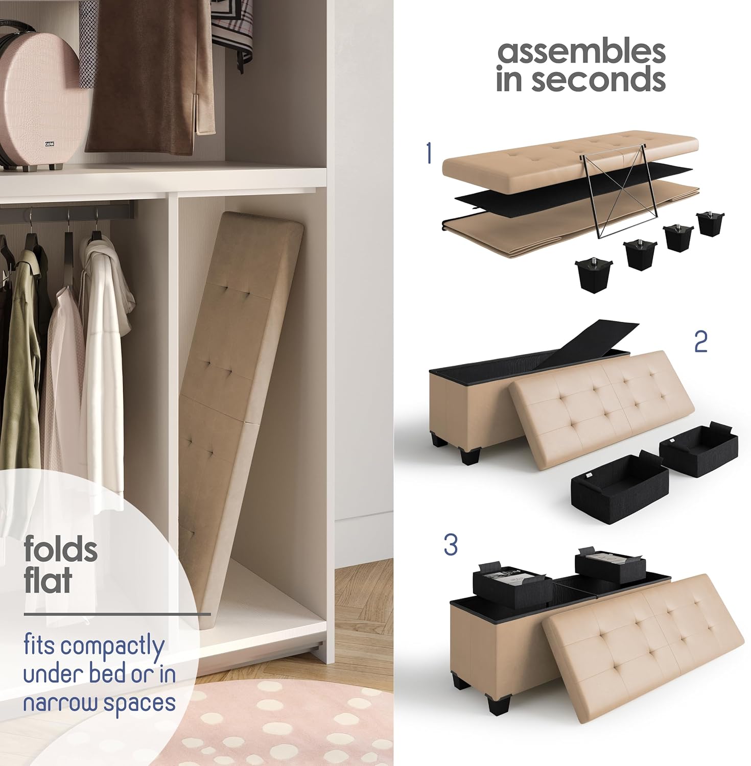STORAGEBUD Storage Ottoman Bench with Bins, 43-in Storage Bench for Bedroom End of Bed, Folding Foot Rest Ottoman for Living Room Max 660lbs, Faux Leather Ottomans, Taupe