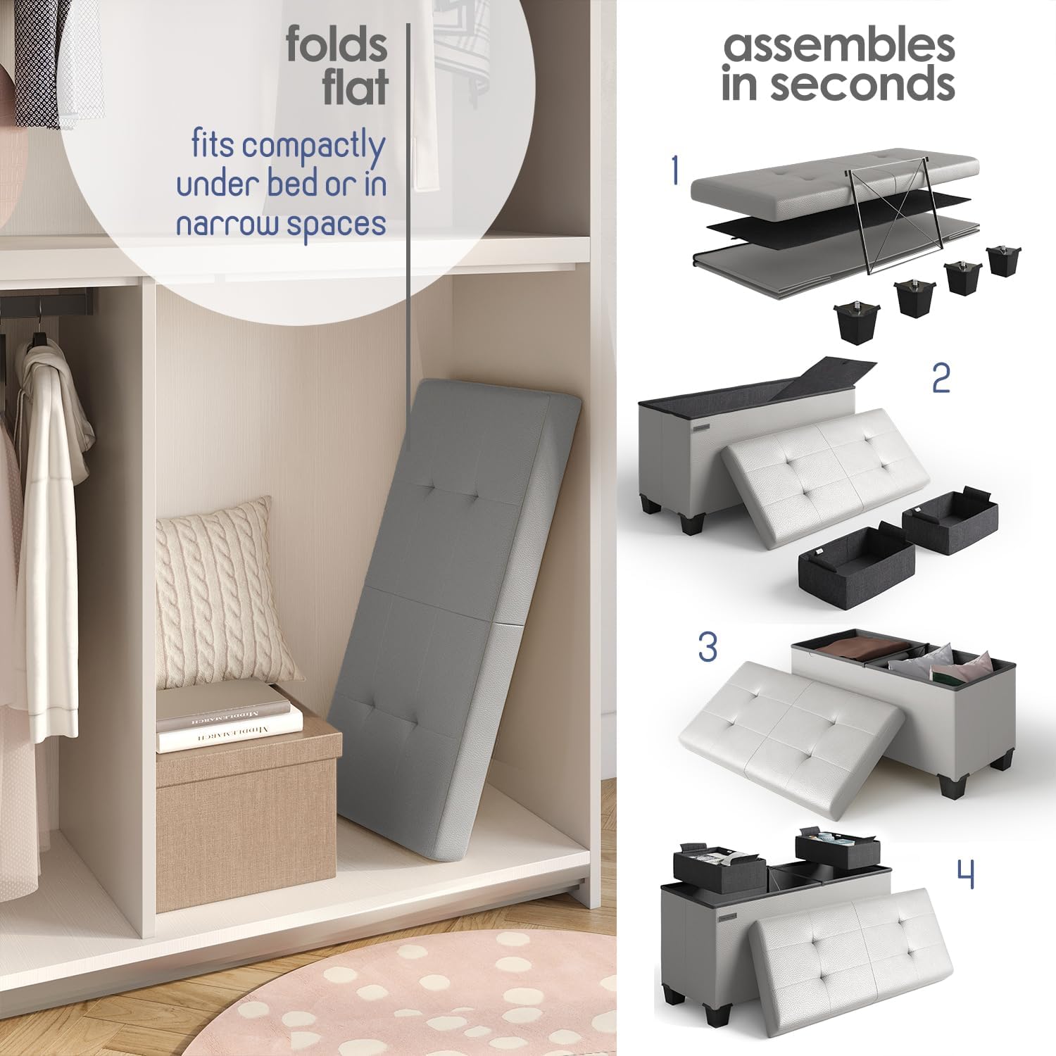- Removable Legs: Our ottoman storage bench for bedroom and kids’ room can fold flat when not in use and measures 30” L x 15" D x 15” H when fully expanded. Adjust the height by adding or removing sturdy 2" legs, adapting this gray ottoman to suit your storage needs.