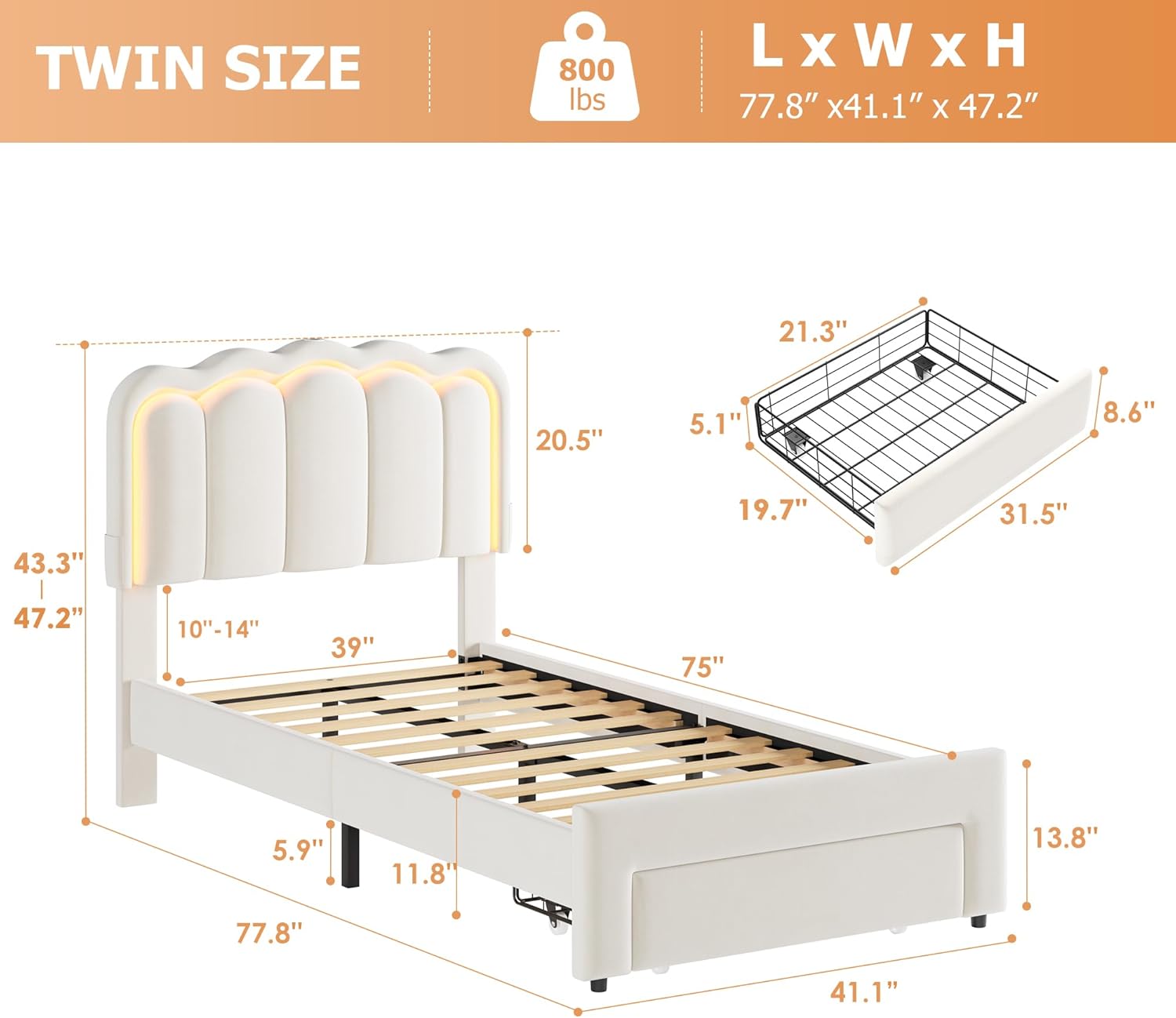 - TWIN BED FRAME WITH STORAGE DRAWER: This beige twin bed frame for kids maximizes space with a large, silent-glide drawer at the footboard for easy storage. The EVA-free barrier design keeps the drawer securely in place without making it hard to pull. With 6 inches of clearance on each side, this twin bed frame girls offers extra space for storage and easy cleaning, plus the air circulation keeps the mattress fresher for longer