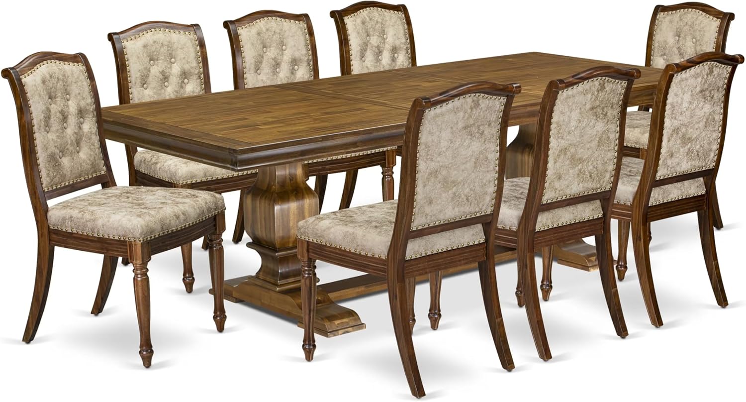 LKMA9-AWA-36 9 Pieces Dining Table Set Includes a Rectangular Dining Table and 8 Light Beige Polyester Fabric Dining Room Chairs, Antique Walnut Finish
