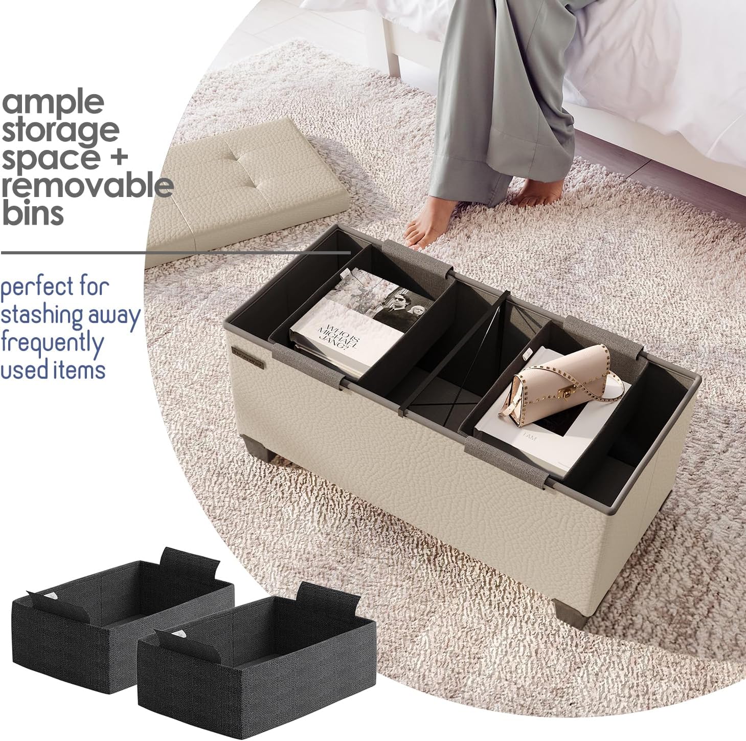 - Two Removable Storage Bins: Keep small, loose items out of sight yet neatly organized with easily accessible storage bins, while the large ottoman space stores bulkier items like throw blankets and pillows.