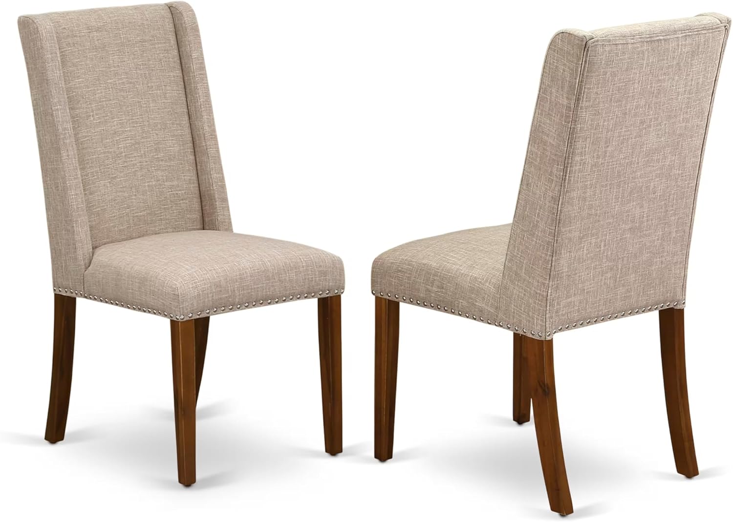 NEFL9-AWA-04-9-Piece Kitchen Set Consists of a Dinner Table and 8 Light Tan Linen Fabric Parson Chairs with Padded Chair Back - Antique Walnut Finish.