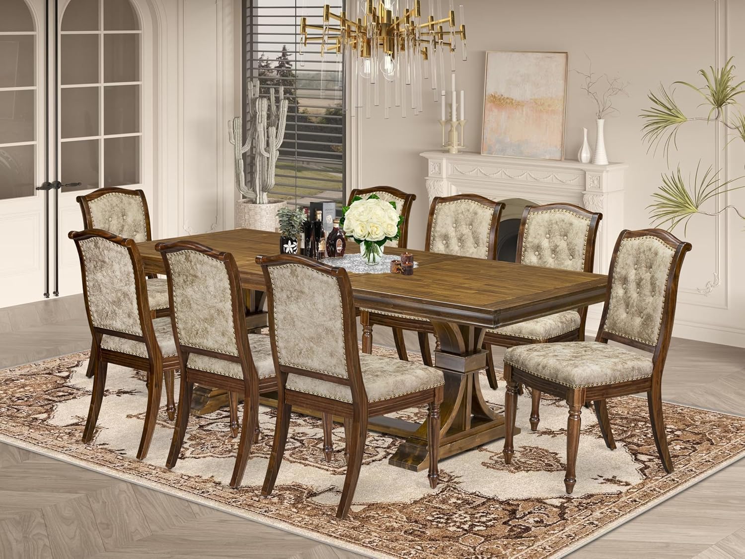 LEMA9-AWA-36 9 Pieces Kitchen Table Set Includes a Rectangular Dining Table and 8 Light Beige Polyester Fabric Dining Chairs, Antique Walnut Finish