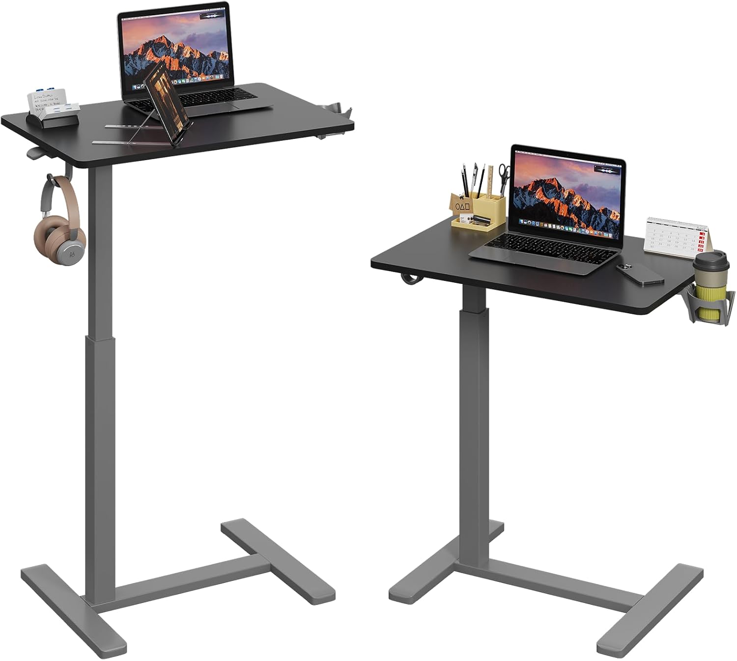 Gas Spring Adjustable Height Rolling Portable Laptop Desk, Mobile Standing Desk on Wheels, Small Sit Stand Desk with Laptop Stand/Cup Holder/Hook (Black Top + Gray Frame, 26"x19")