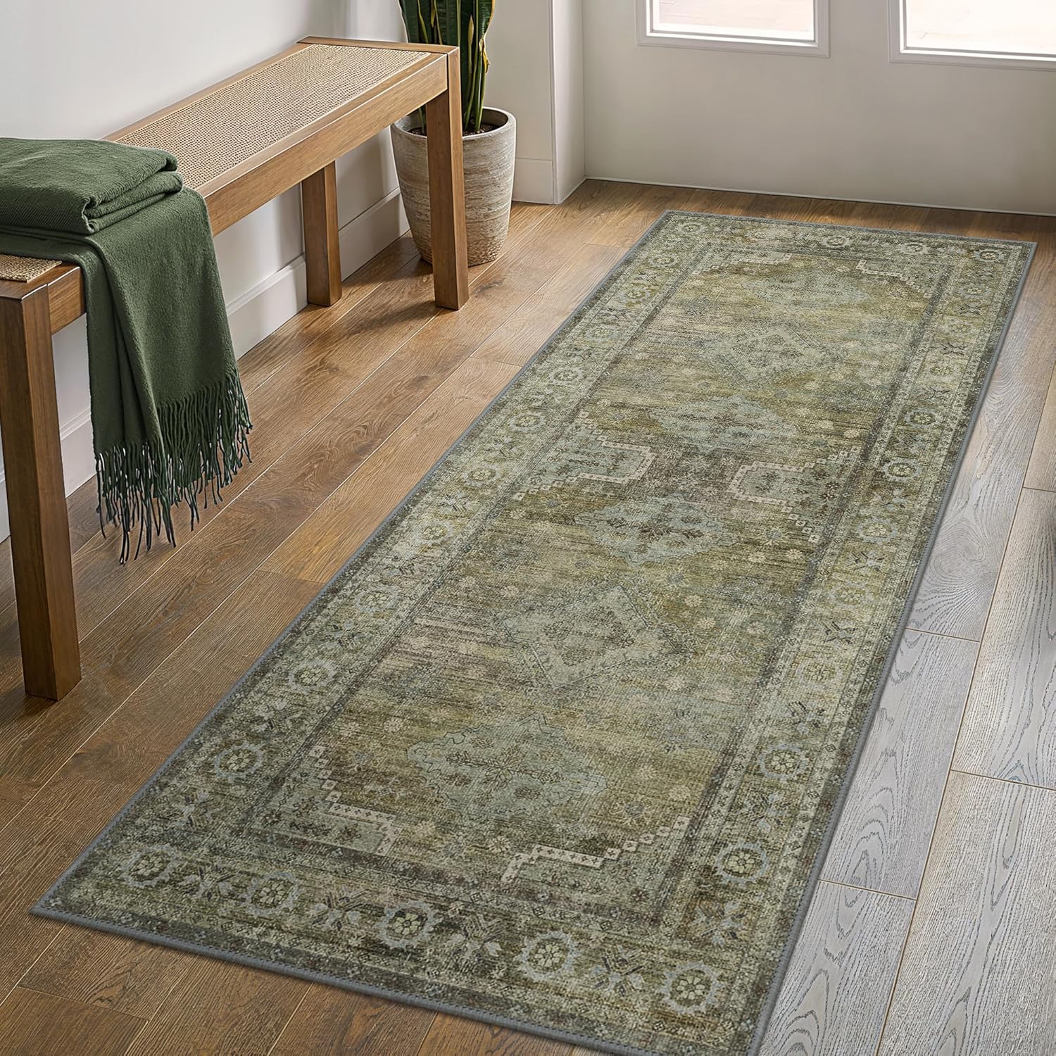GENIMO Runner Rug 2x7 Non Slip Machine Washable Vintage Hallway Runner Rugs, Low Pile Lightweight Mat for Living Room, Entryway, Bedroom, Kitchen and Corridor, Distressed Sage