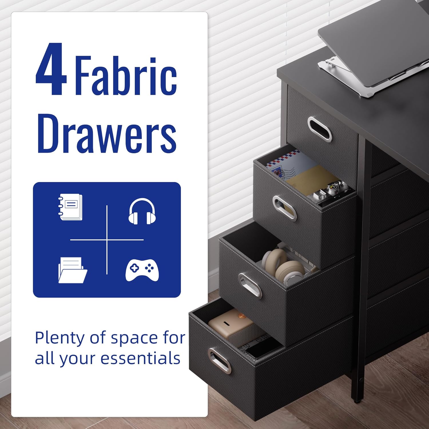 - 4 Drawers Computer Desk: Featuring 4 pull-out fabric drawers, this computer desk offers ample storage space for your office or gaming essentials, while maintaining a clear and functional desktop. Each drawer can support up to 10 lbs (about 3 laptops), helping you keep your office or study supplies organized and easily accessible.