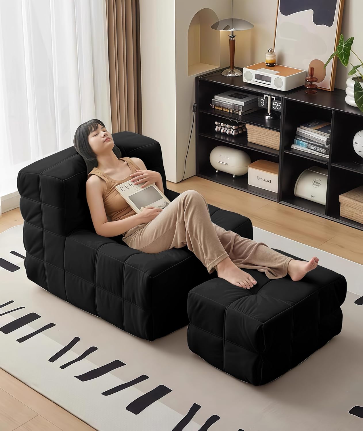 Bean Bag Chair - Memory Foam Bean Bag Chair for Adults, Comfy High-Resilience Single Sofa, Small Space Floor Chair, Chaise Lounge for Living Room, Bedroom (Black, Square + Ottoman)