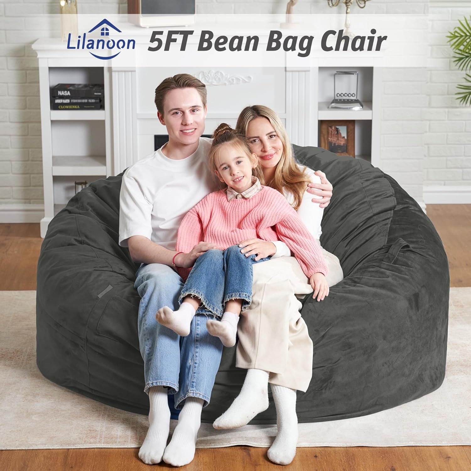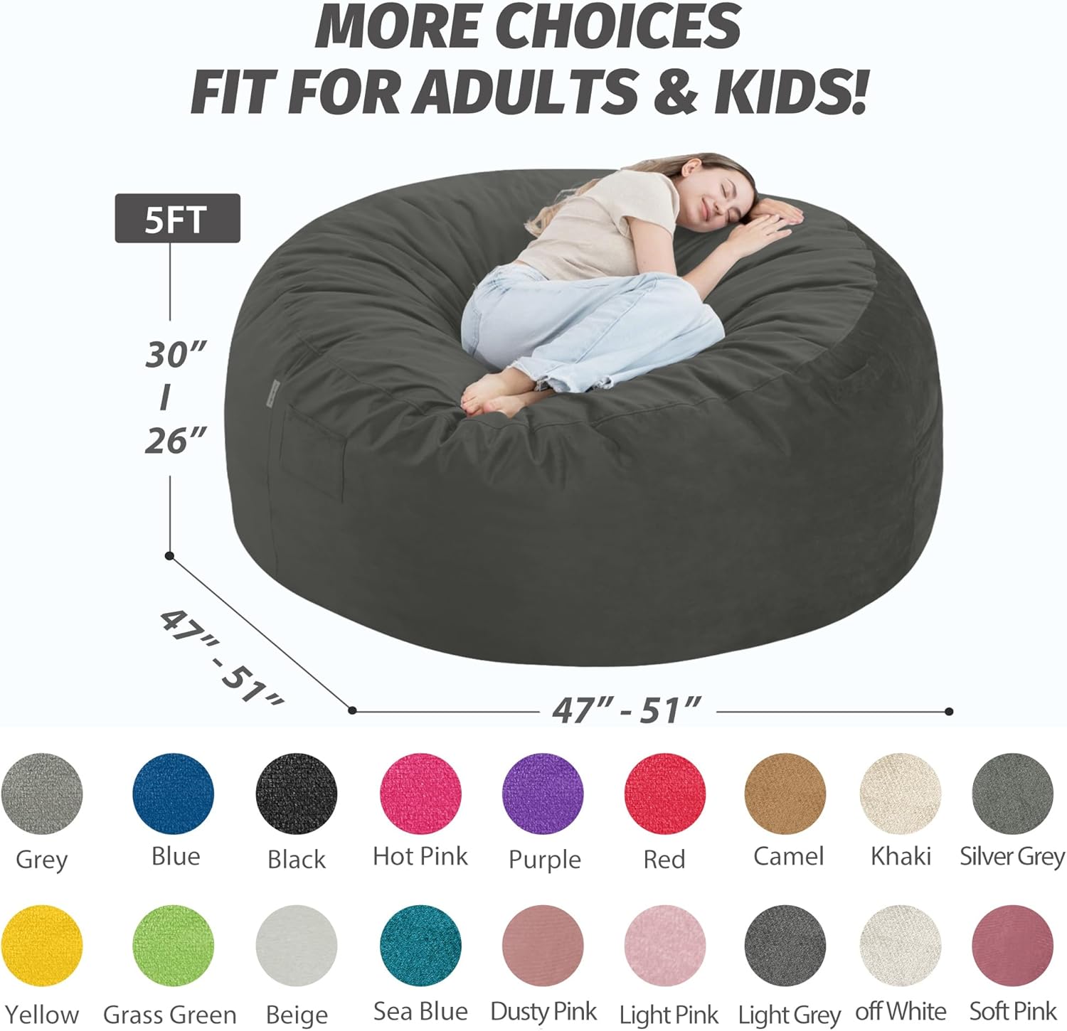 5FT Bean Bag Chair with Ultra Soft Velvet Cover Bean Bag Sofa with Memory Foam Bean Bag Chairs with Large Size Lazy Sofa for Dorm Office Living Room Bedroom Grey 5'