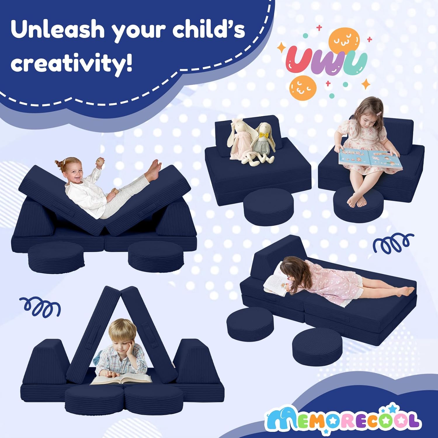 MeMoreCool Kids Couch for Playroom, Corduroy Convertible Toddler Couch, 8 Piece Modular Play Sofa, Foam Fort Building Set for Child Room Furniture, Navy