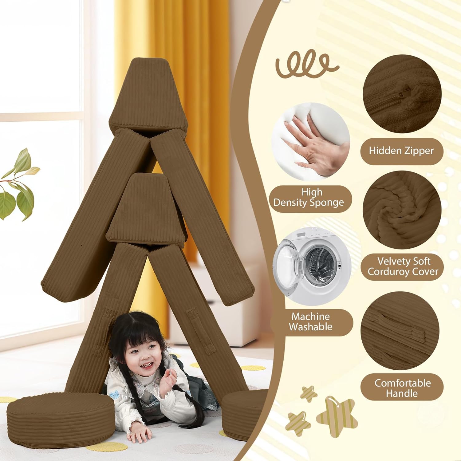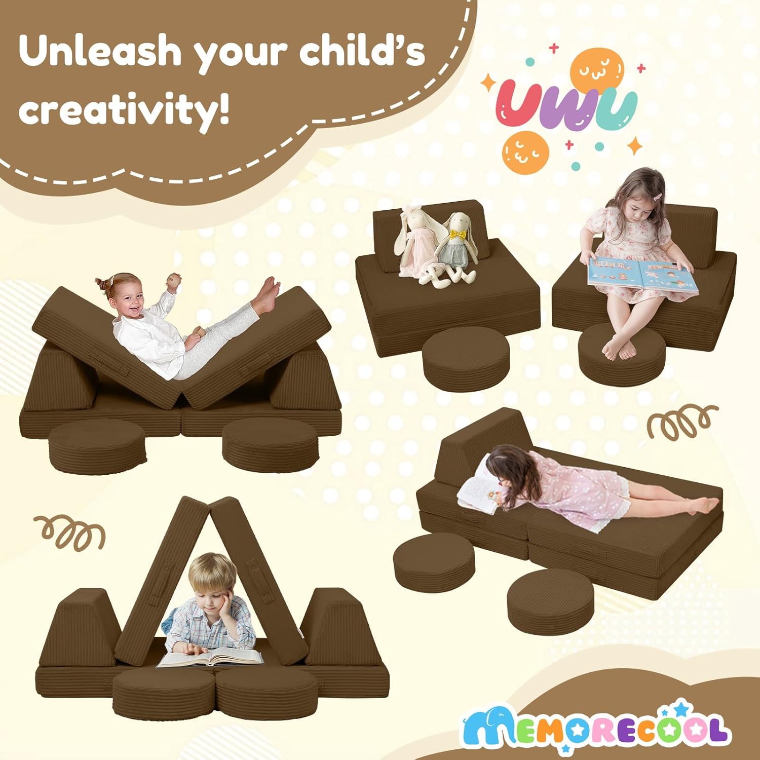 MeMoreCool Kids Couch for Playroom, Corduroy Convertible Toddler Couch, 8 Piece Modular Play Sofa, Foam Fort Building Set for Child Room Furniture, Brown