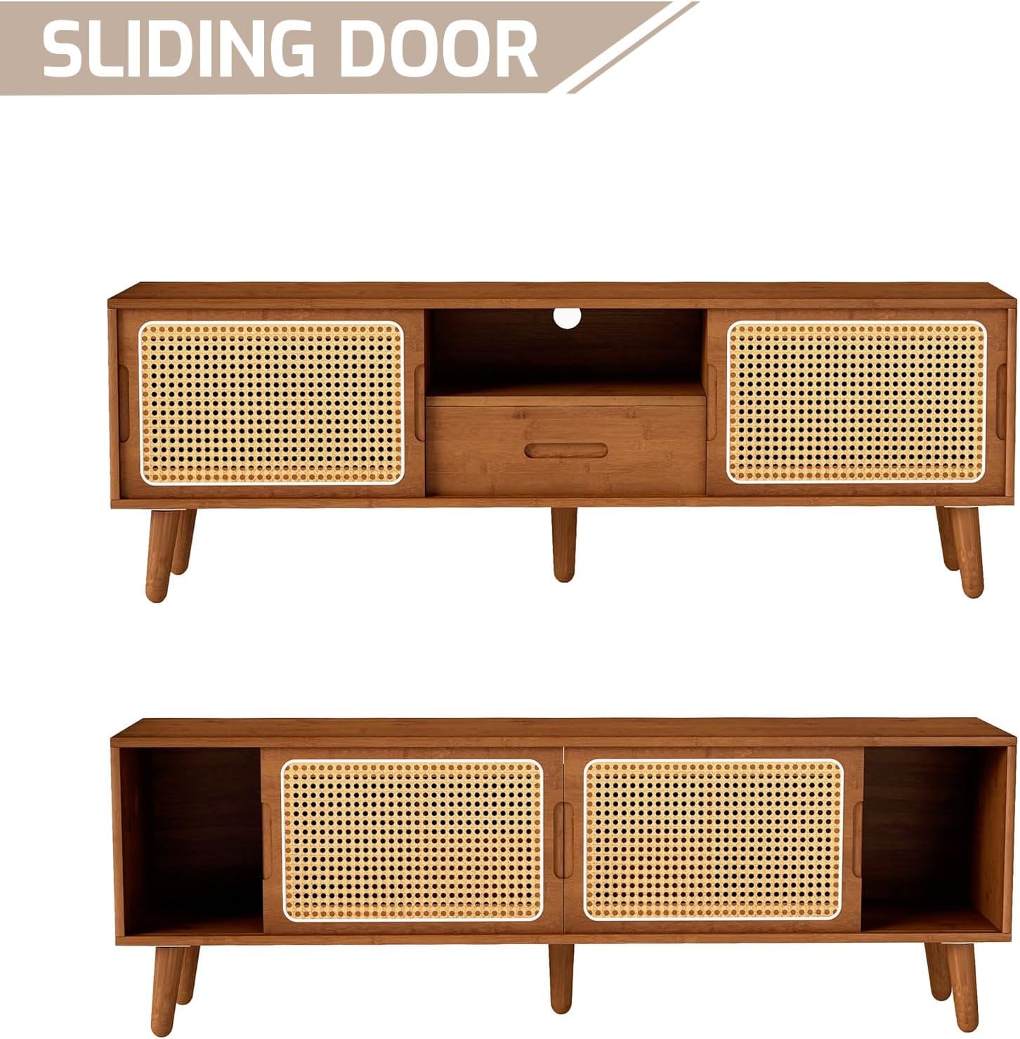HollyHOME Bamboo TV Stand with Storage for TVs up to 65", Modern Entertainment Center with Rattan and Drawer, Accent TV Table with 2 Shelf, Media Console Cabinet for Living Room, Bedroom, Walnut
