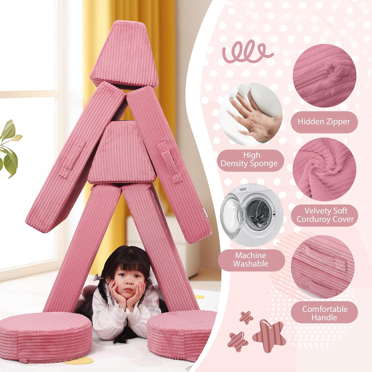 MeMoreCool Kids Couch for Playroom, Corduroy Convertible Toddler Couch, 8 Piece Modular Play Sofa, Foam Fort Building Set for Child Room Furniture, Pink