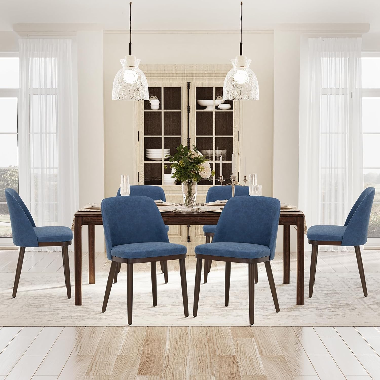 COLAMY Upholstered Dining Chairs Set of 6, Modern Kitchen Chairs with Back, Leather Side Dining Room Chairs with Wood Legs for Kitchen Dining Room Restaurant, Blue