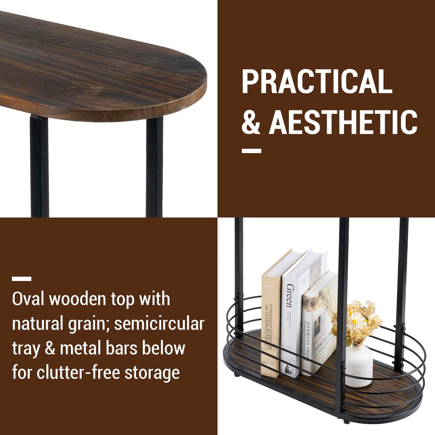 - Oval-shaped end table is crafted from solid wood, matte black powder-coated metal square tubes and 6mm gauge wire for structural support with an airy feel