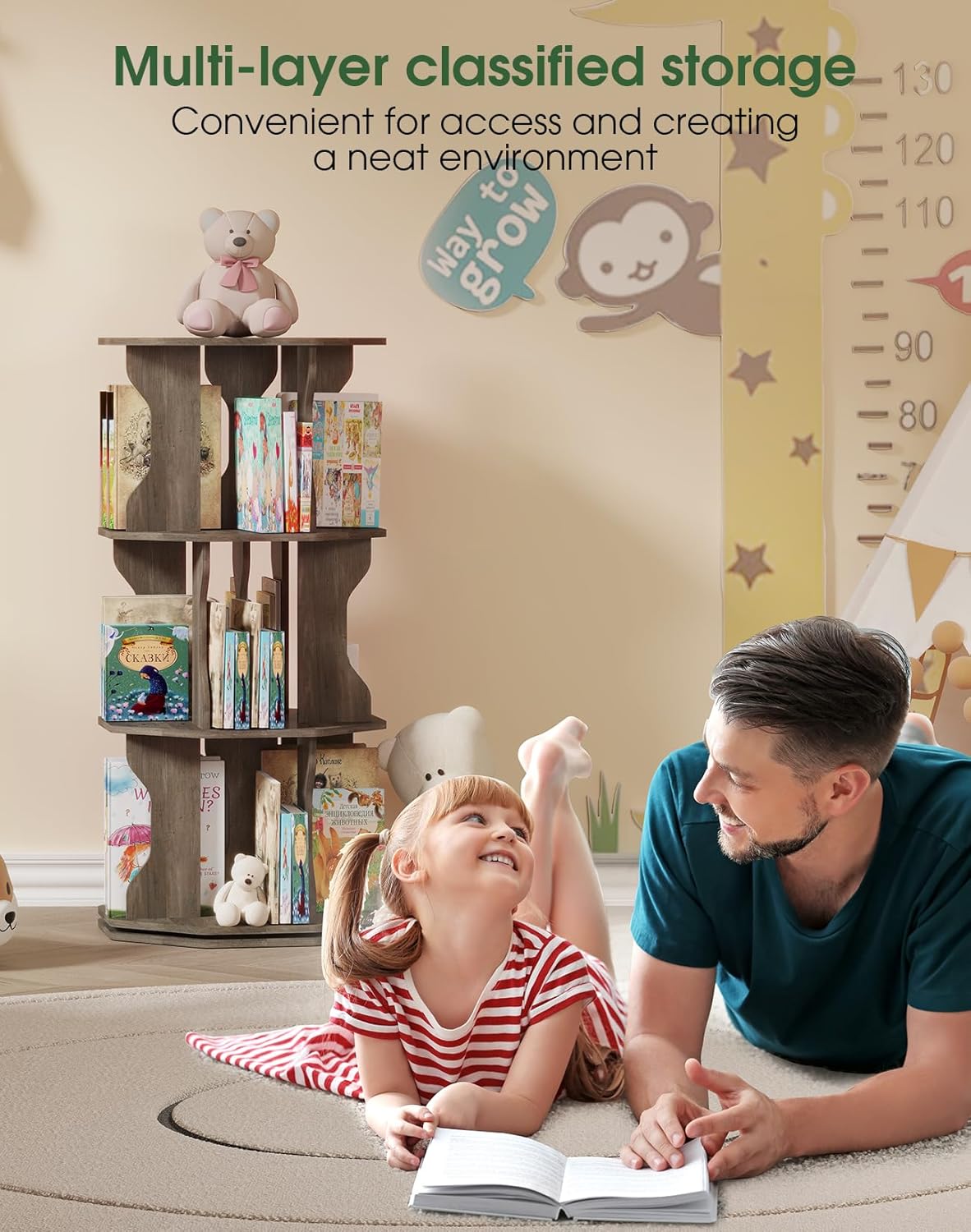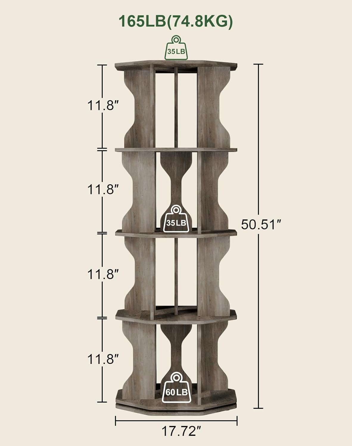 - 【360° Rotating Bookcase Tower & Octagonal Design】With its innovative rotating design, your favorite book is just a spin away. 2-layer thickened base and an enlarged turntable, it guarantees stable and silent rotation, The distinctive octagonal design, makes it a stylish and practical addition to any space.