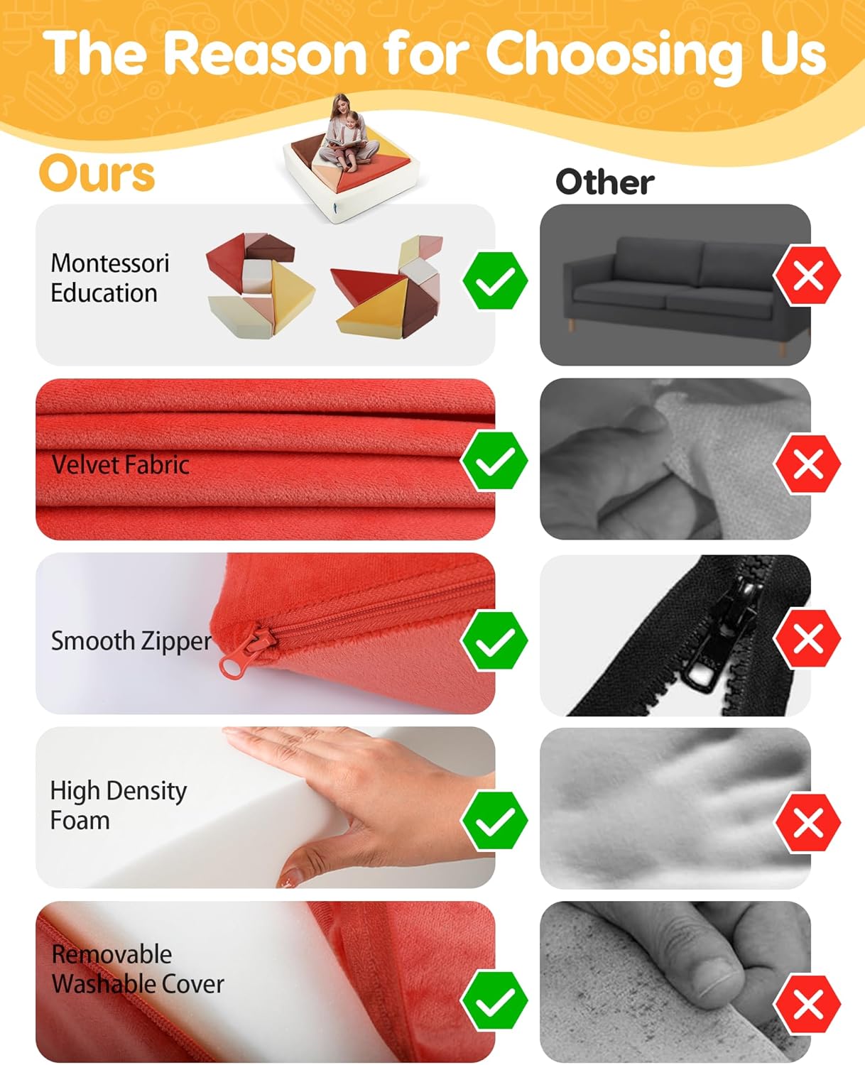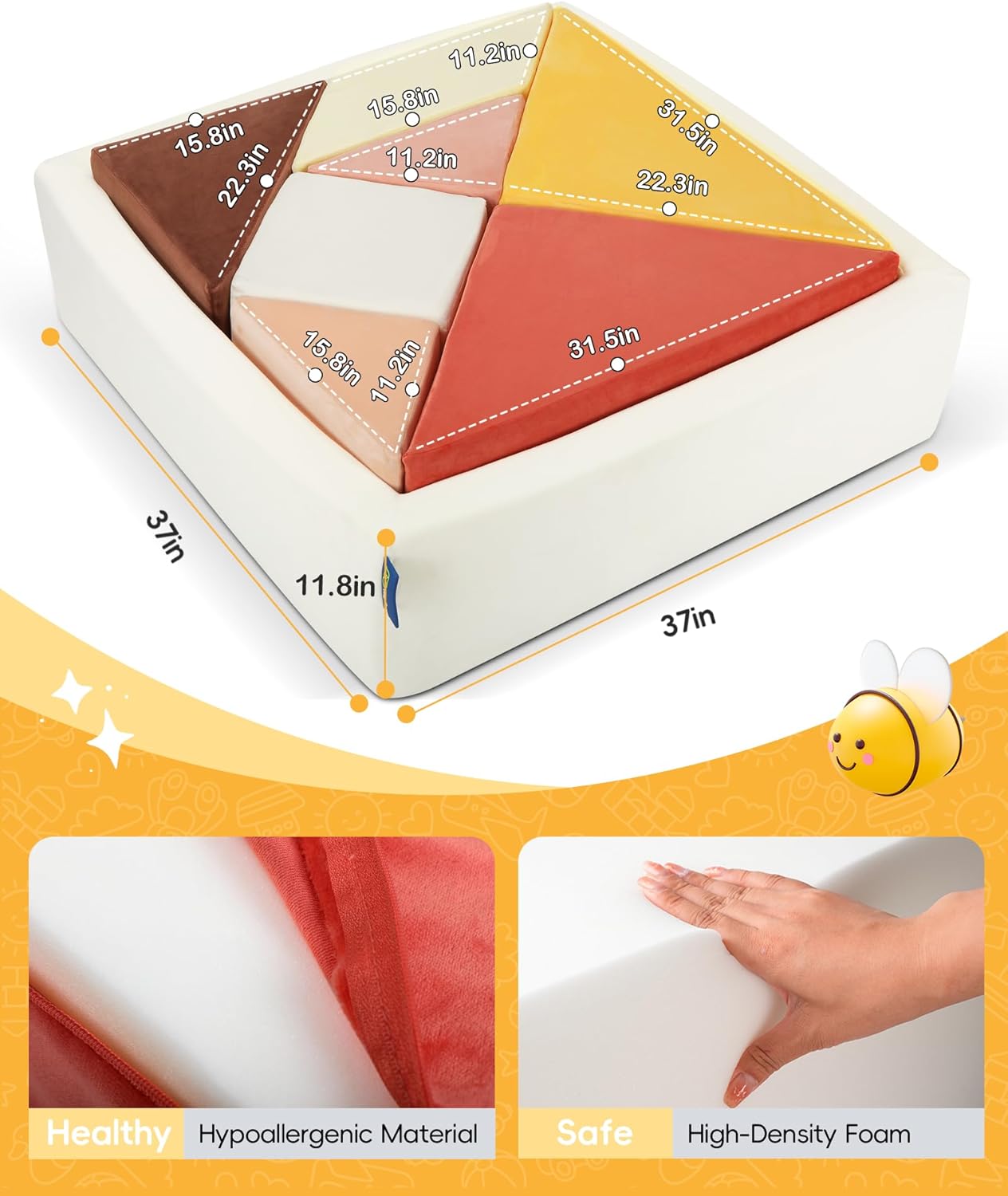 - Upgraded Material: This kid play sofa's foam core is made of high-density material, providing strong rebound and a soft, low-impact surface for kids. Safety is considered in the sofa's design, allowing children to jump, climb, and bounce without any harmful hard edges or sharp corners to bump into! The toddler play couch is separate and freely combined to create many interesting shapes. The kids play couch sofa is a perfect addition to any playroom, inspiring imagination and enjoyable play.