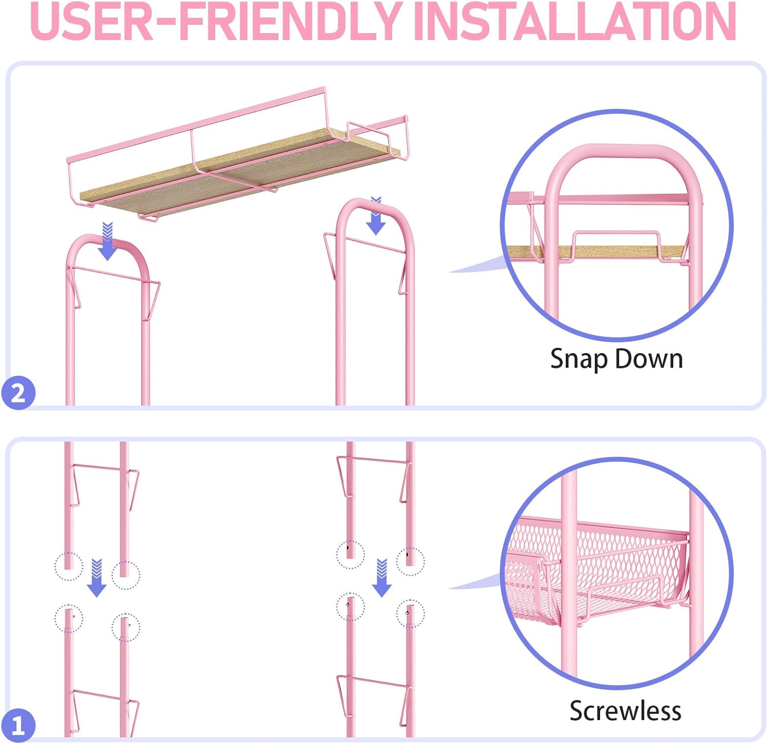 - 【EFFORTLESS SETUP】It's easy to put this narrow slide - out cart together. You don't need screws or tools. Just snap the mesh baskets onto the side rack and push in the 4 wheels. Then the wheels can spin all the way around.