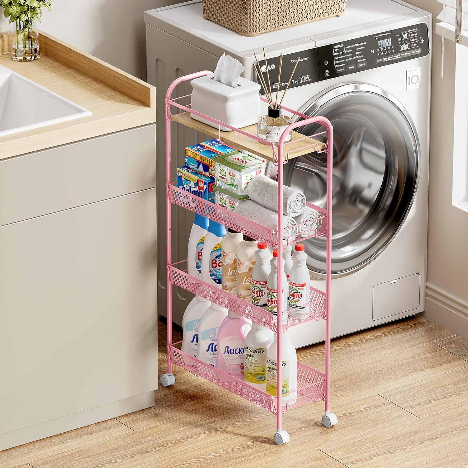 KINGRACK Metal Slim Rolling Cart,4-Tier Metal Utility Cart,Storage Cart with Wooden Tabletop, for Narrow Space on Laundry Bathroom Kitchen Room Bedroom Apartments Dormitory (Pure Pink, Slim)