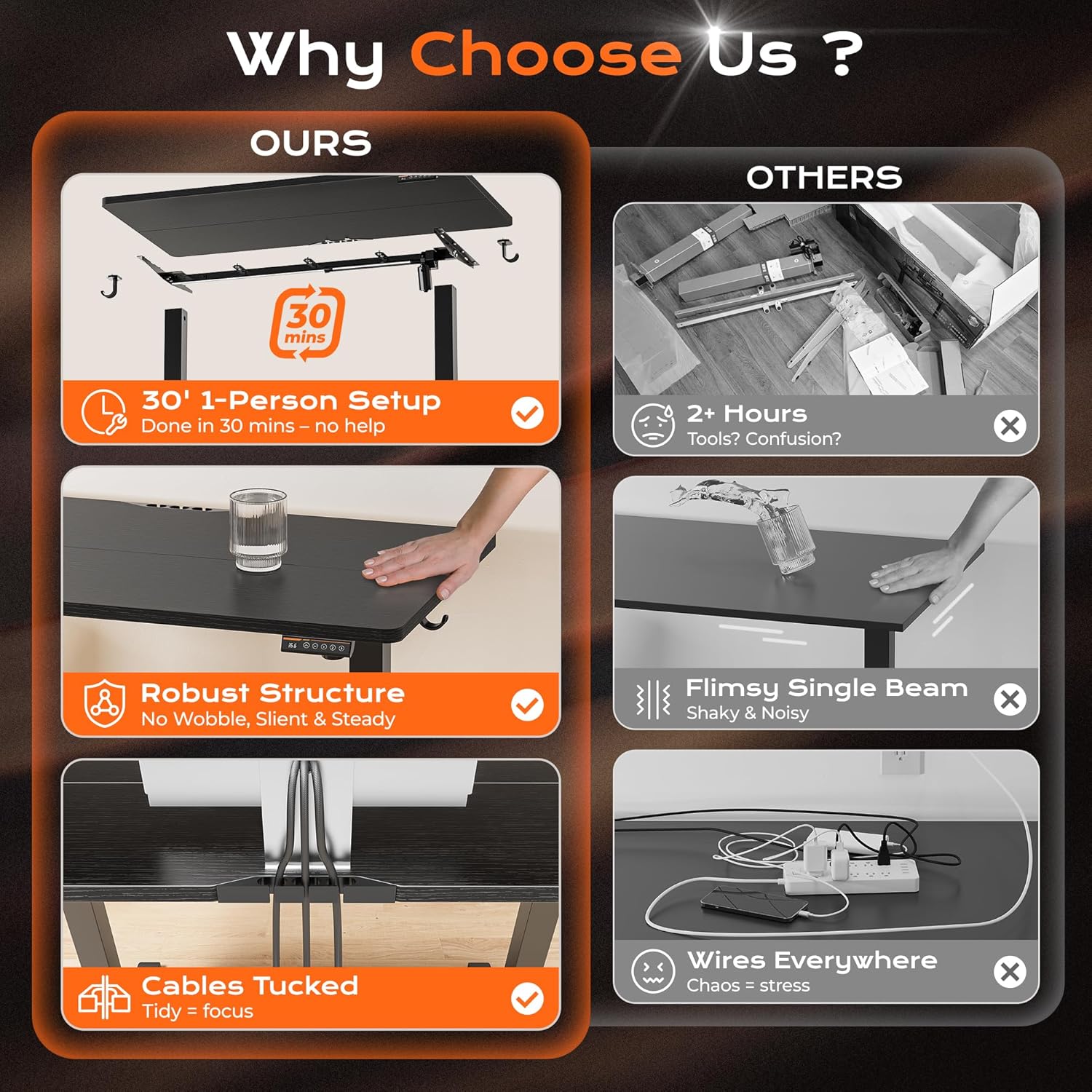- 【Whisper-Quiet Operation】Powered by a robust yet quiet motor (operating at less than 45 DB), the wide deep desk brings smooth height adjustments without disturbing your household or office environment. This standup desk for home office is ideal for keeping focus and slient
